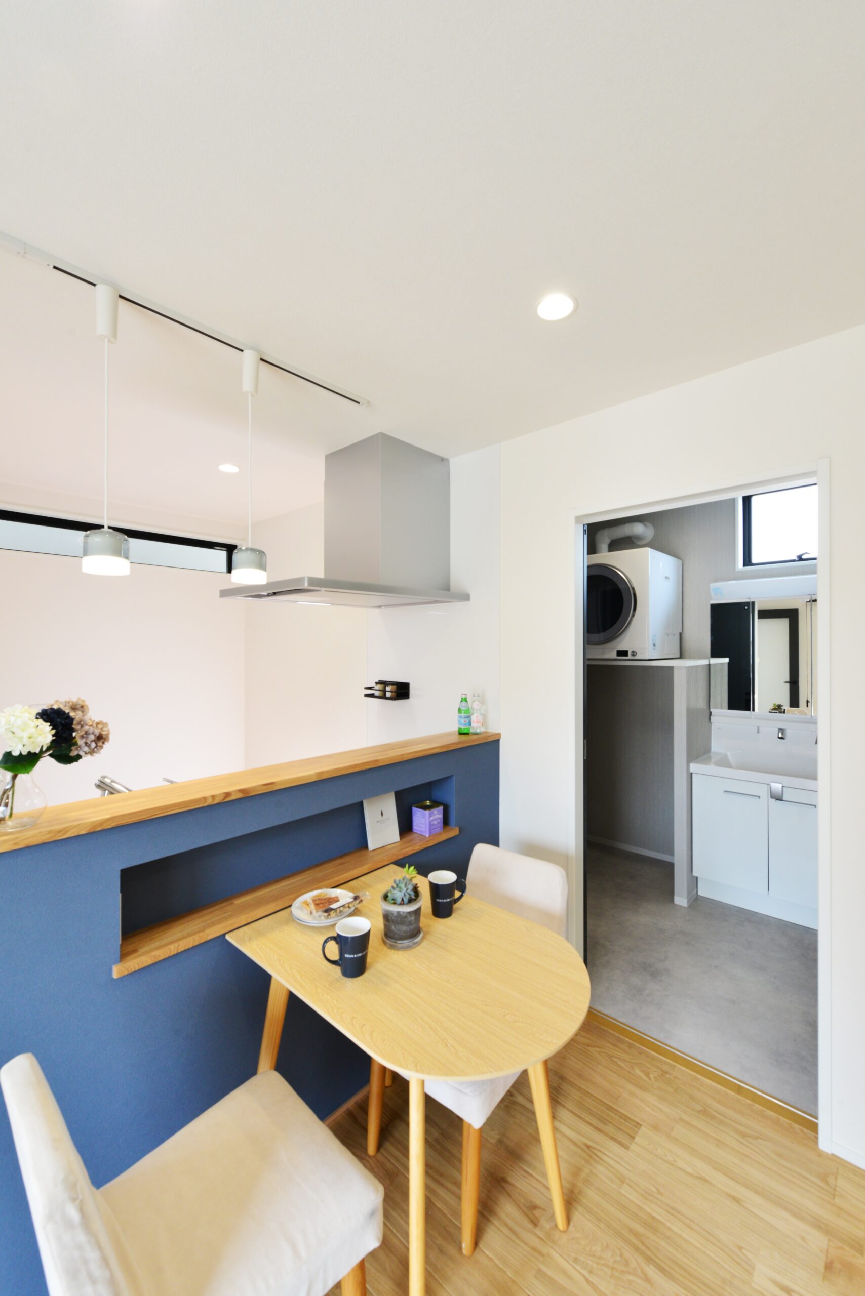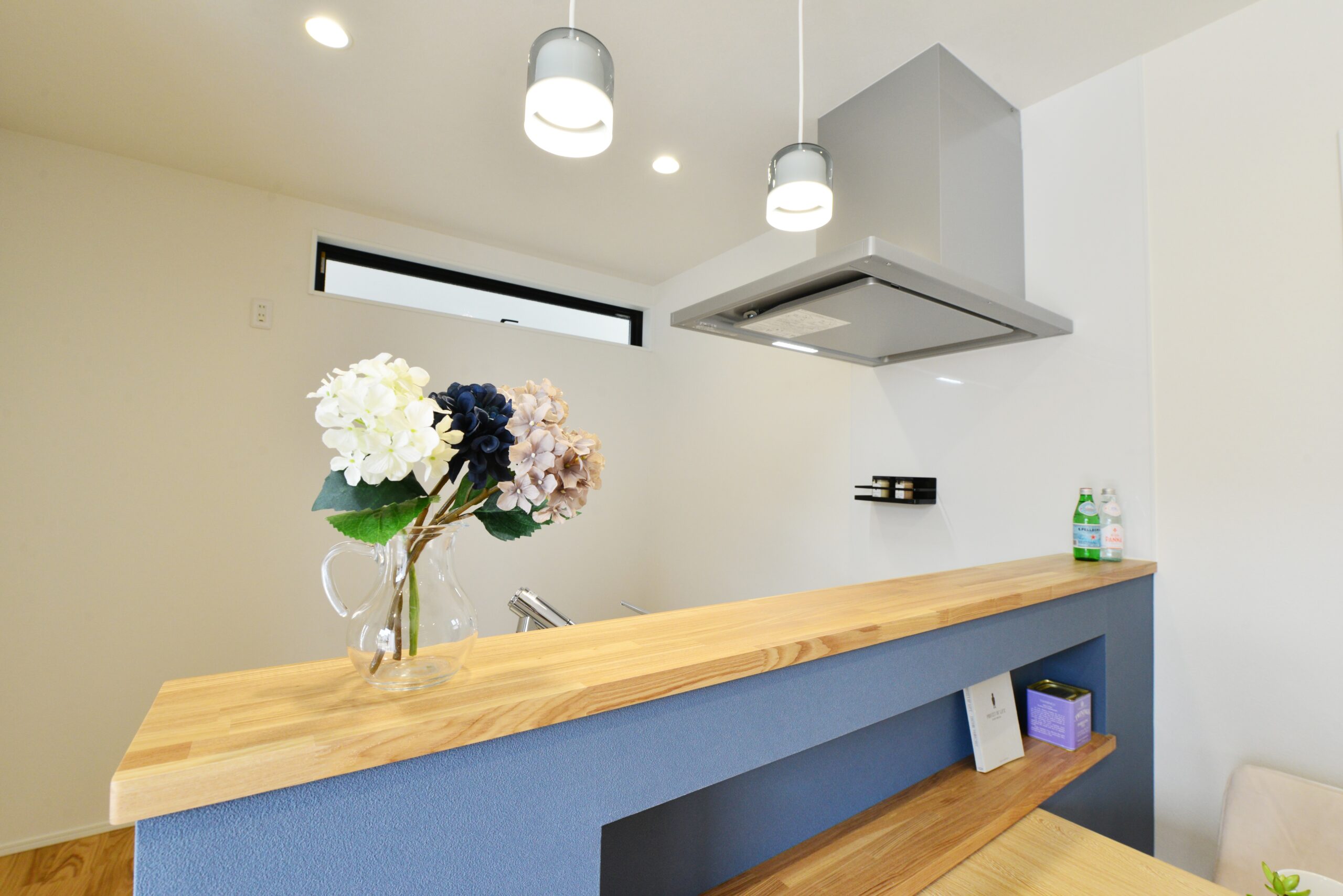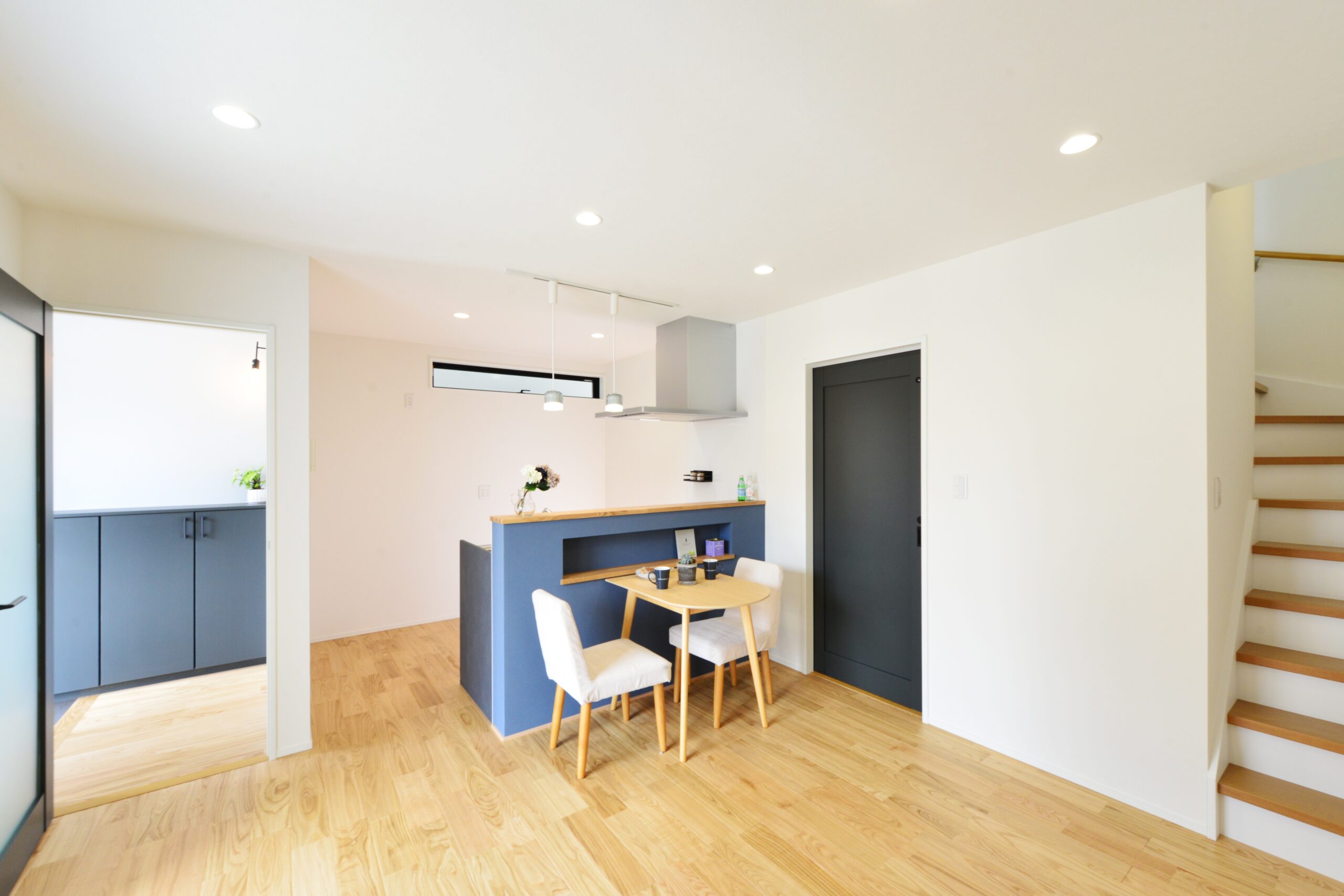 無垢の栗材を使用し美しい木目が自然で良い風合いを出しています。アクセントの色を入れることによってよりオシャレな空間を演出。南からはたくさんの光が射し込み明るい室内となっています。
