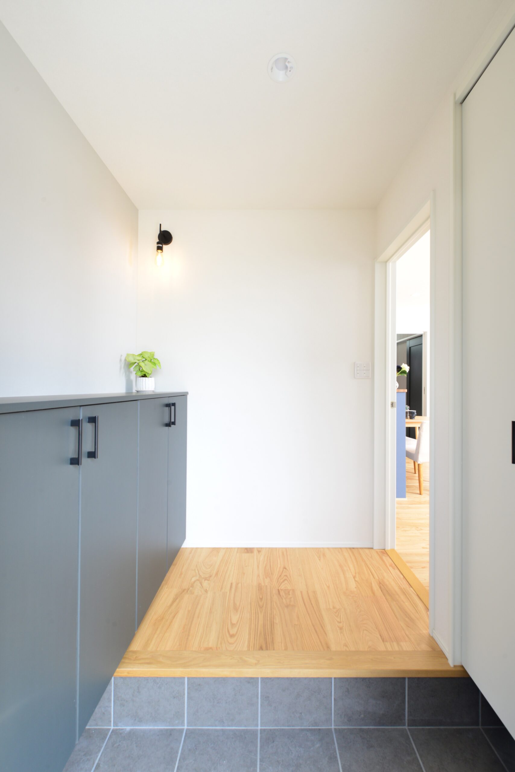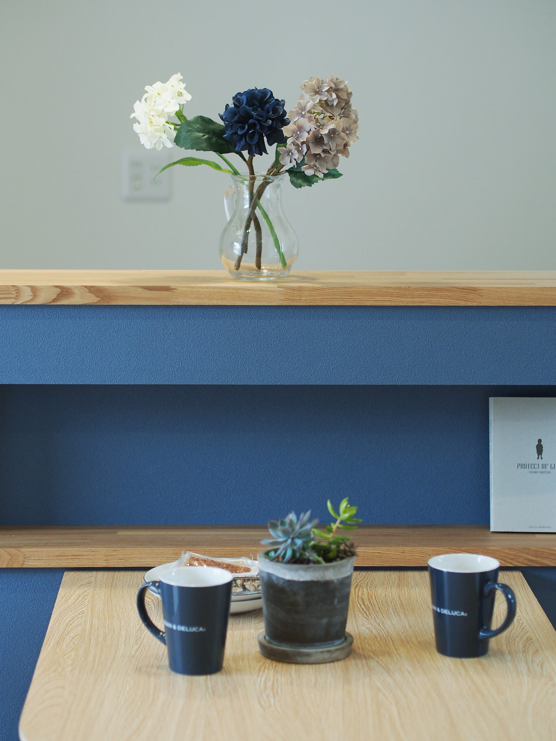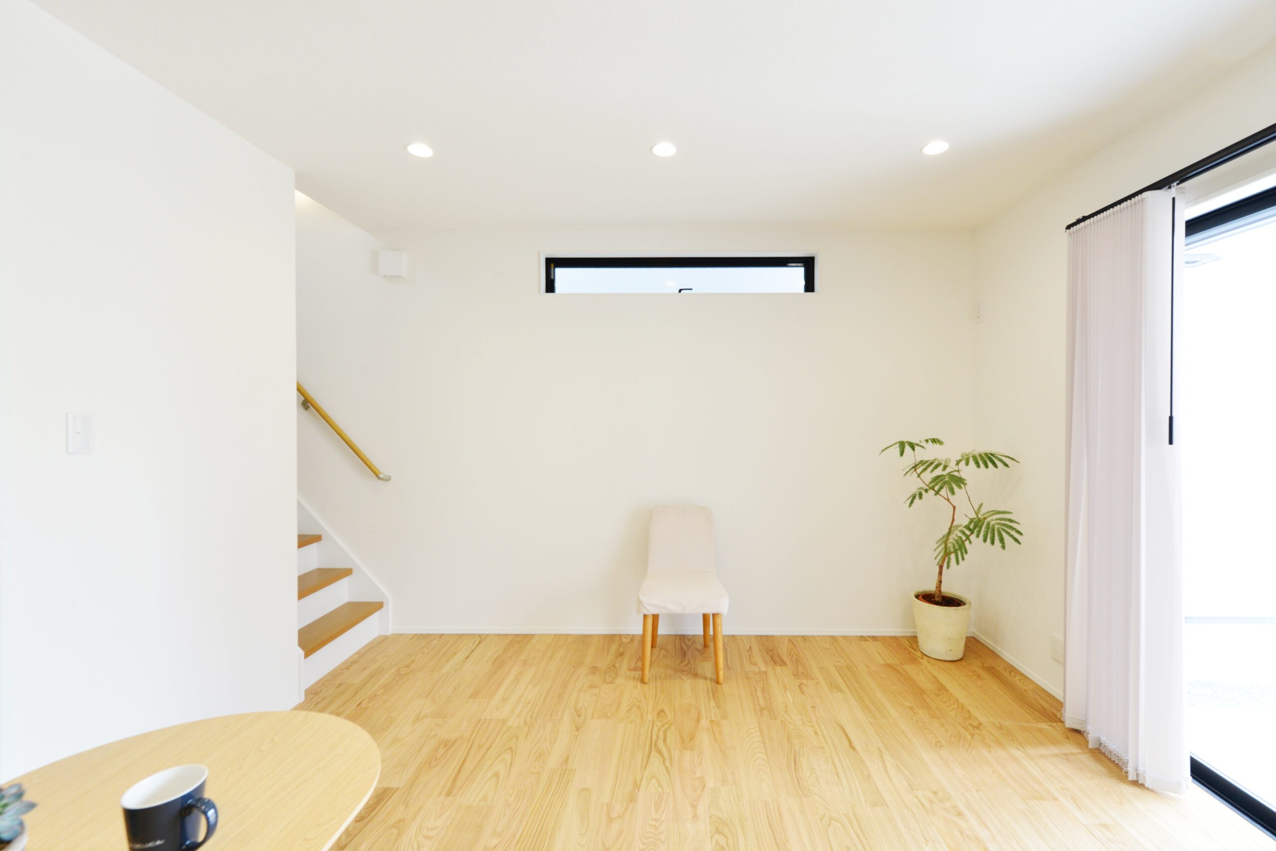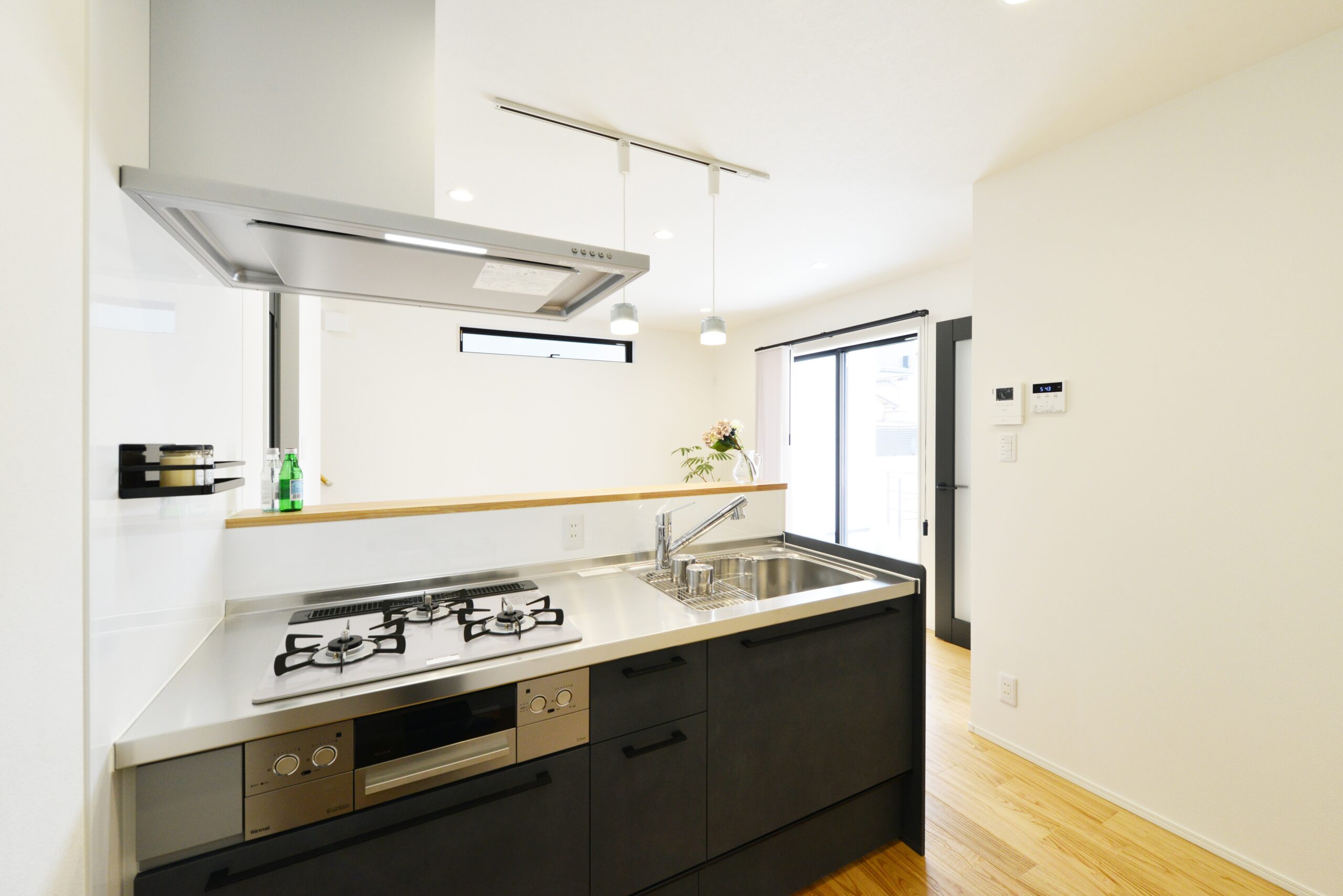 無垢の栗材を使用し美しい木目が自然で良い風合いを出しています。アクセントの色を入れることによってよりオシャレな空間を演出。南からはたくさんの光が射し込み明るい室内となっています。