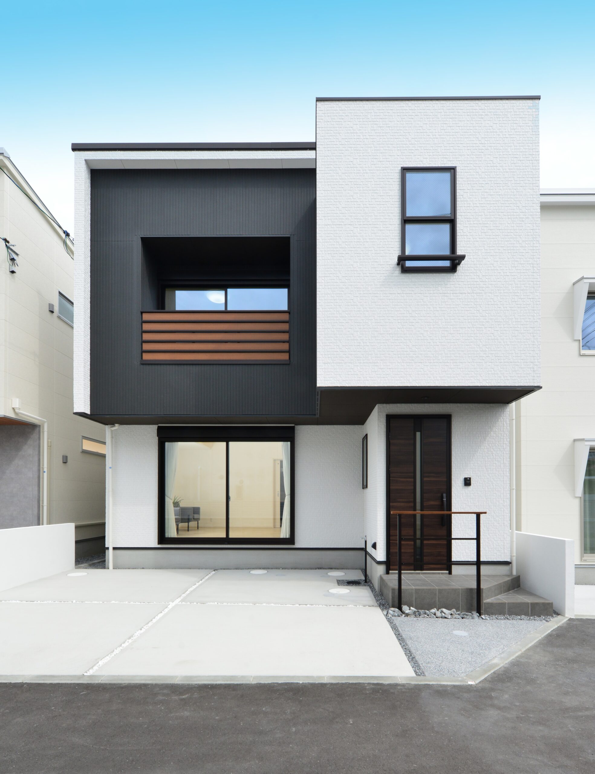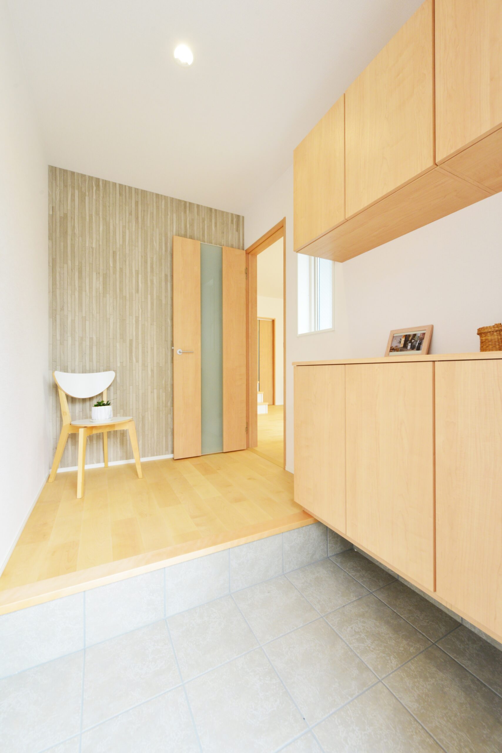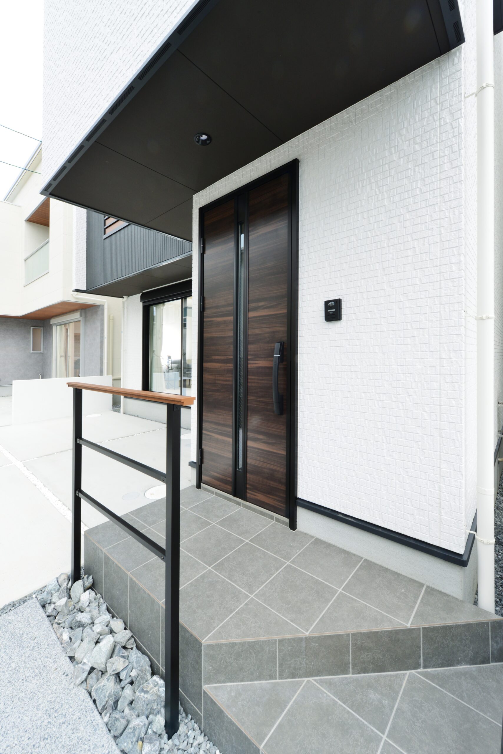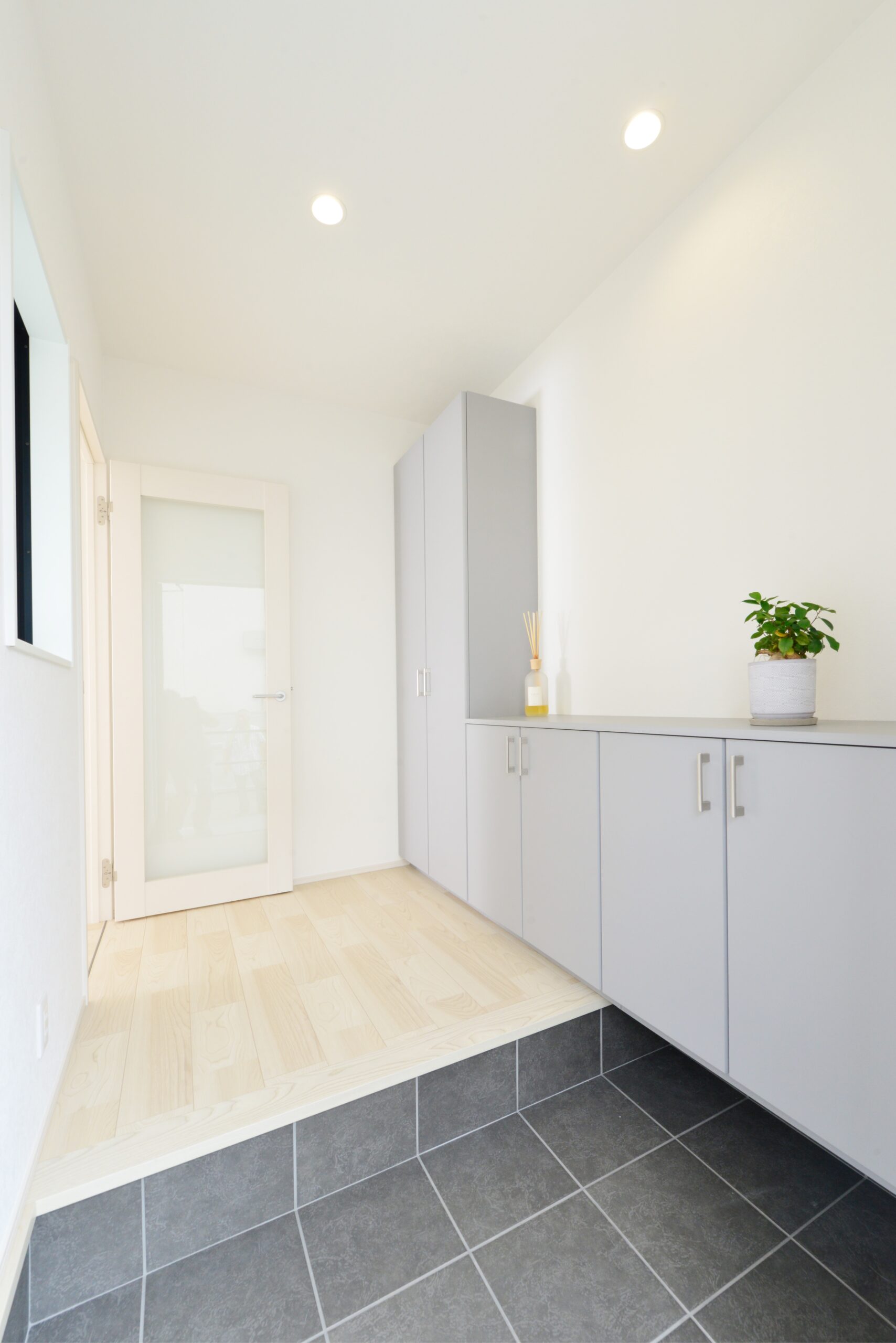白とグレー色を使った優しい色合いの外観。広めの玄関の正面にはタイルを貼り