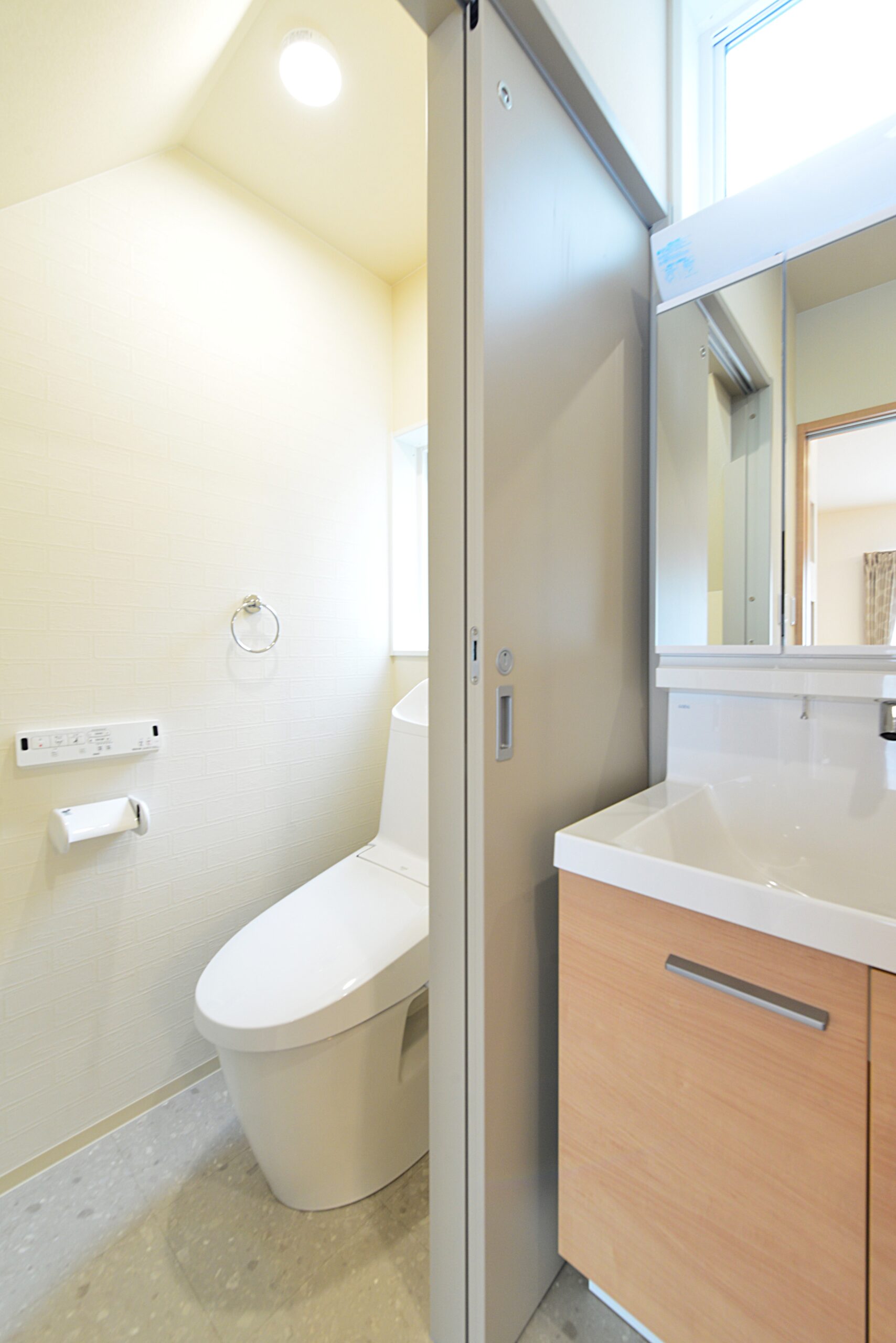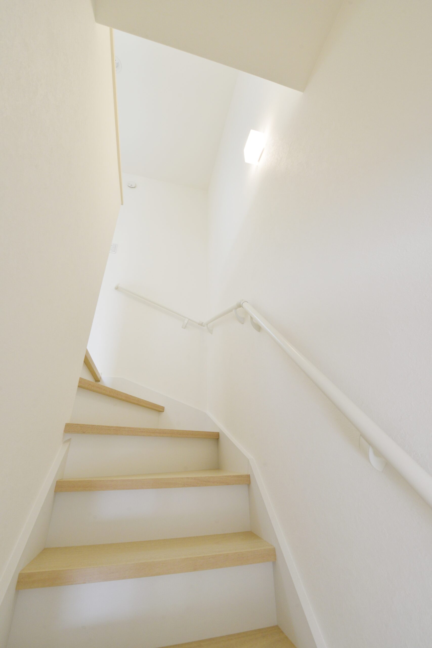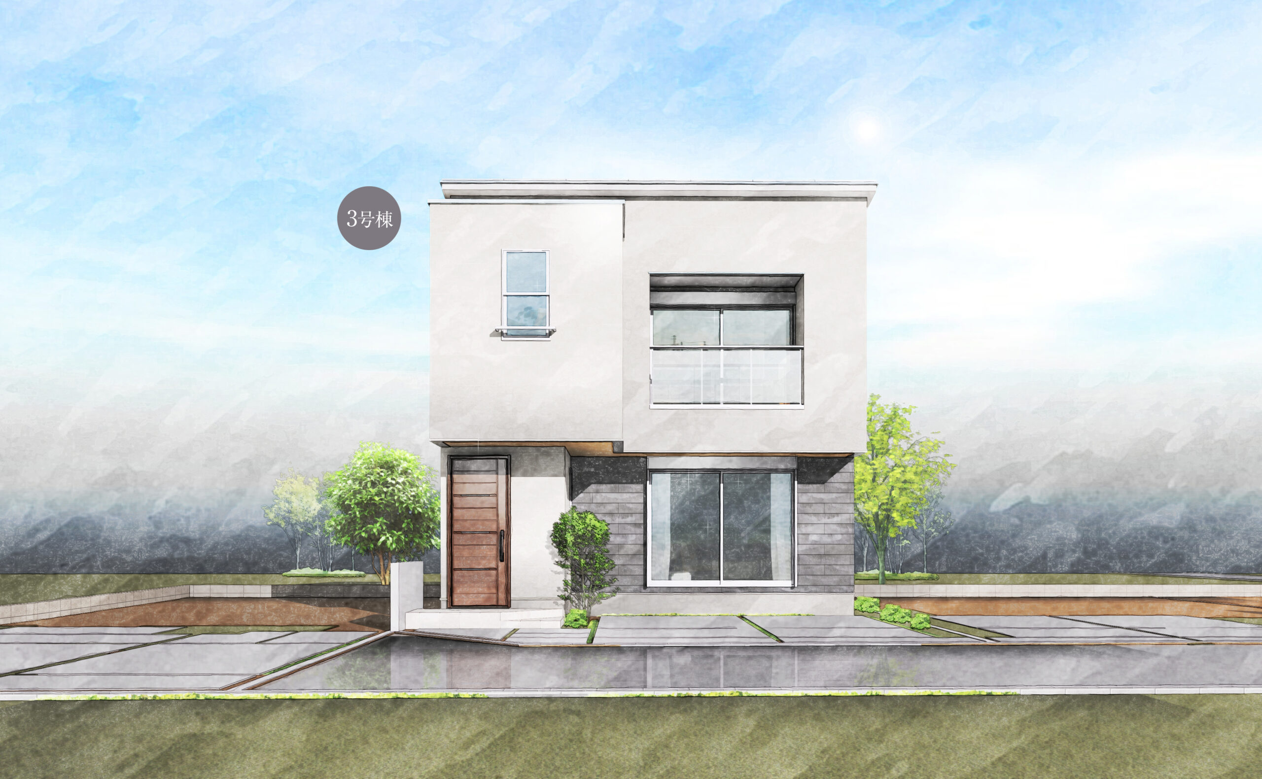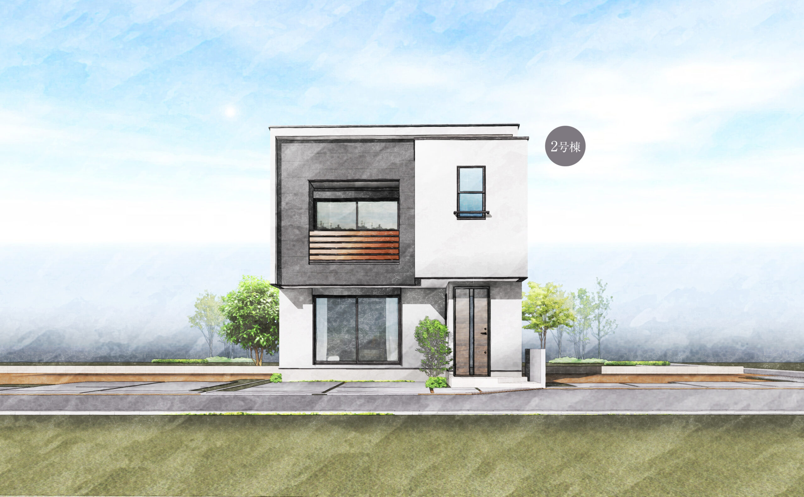 白とグレー色を使った優しい色合いの外観。広めの玄関の正面にはタイルを貼り