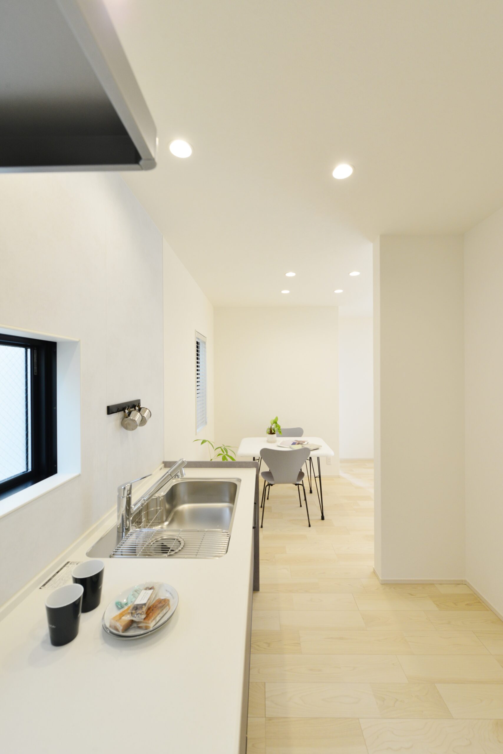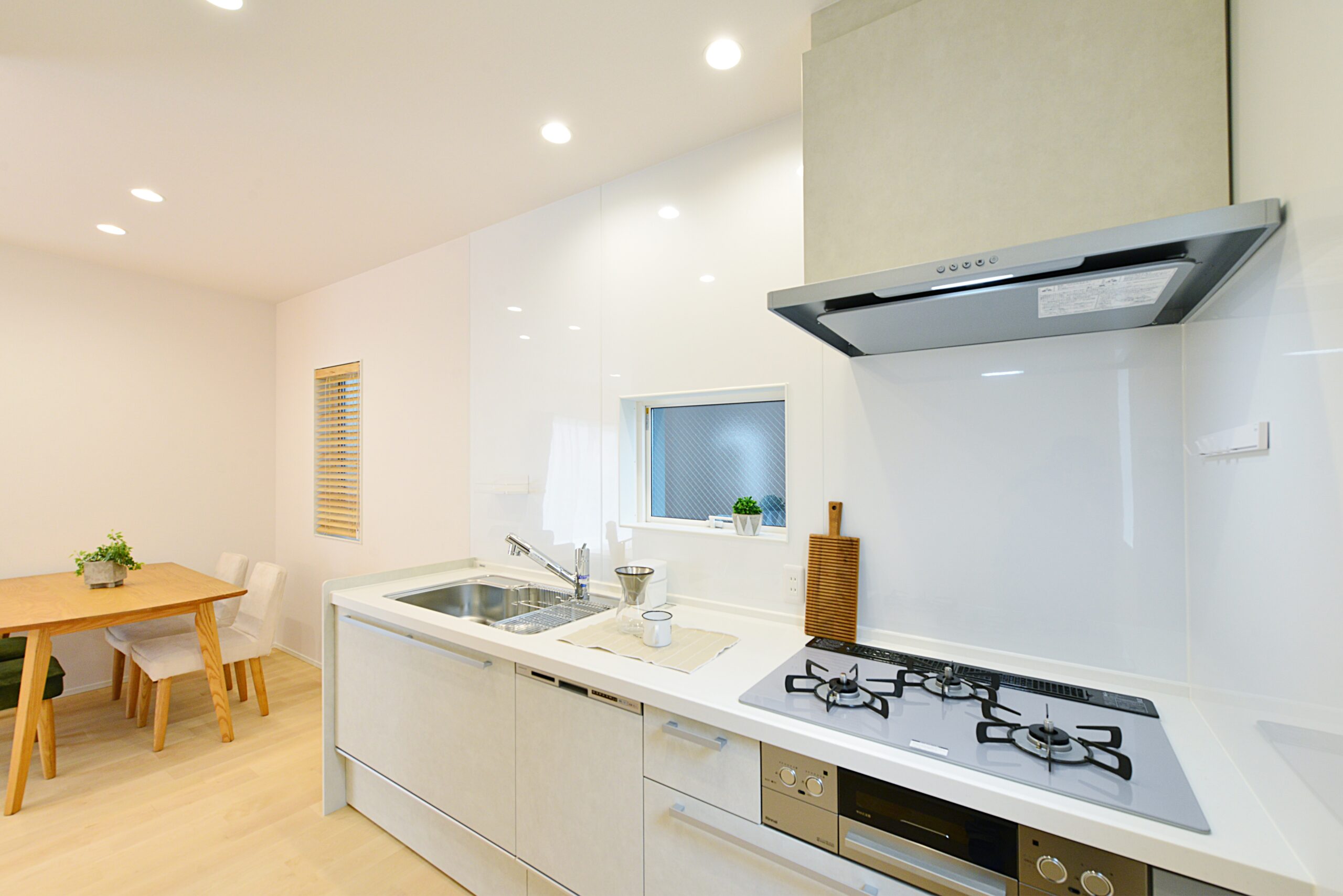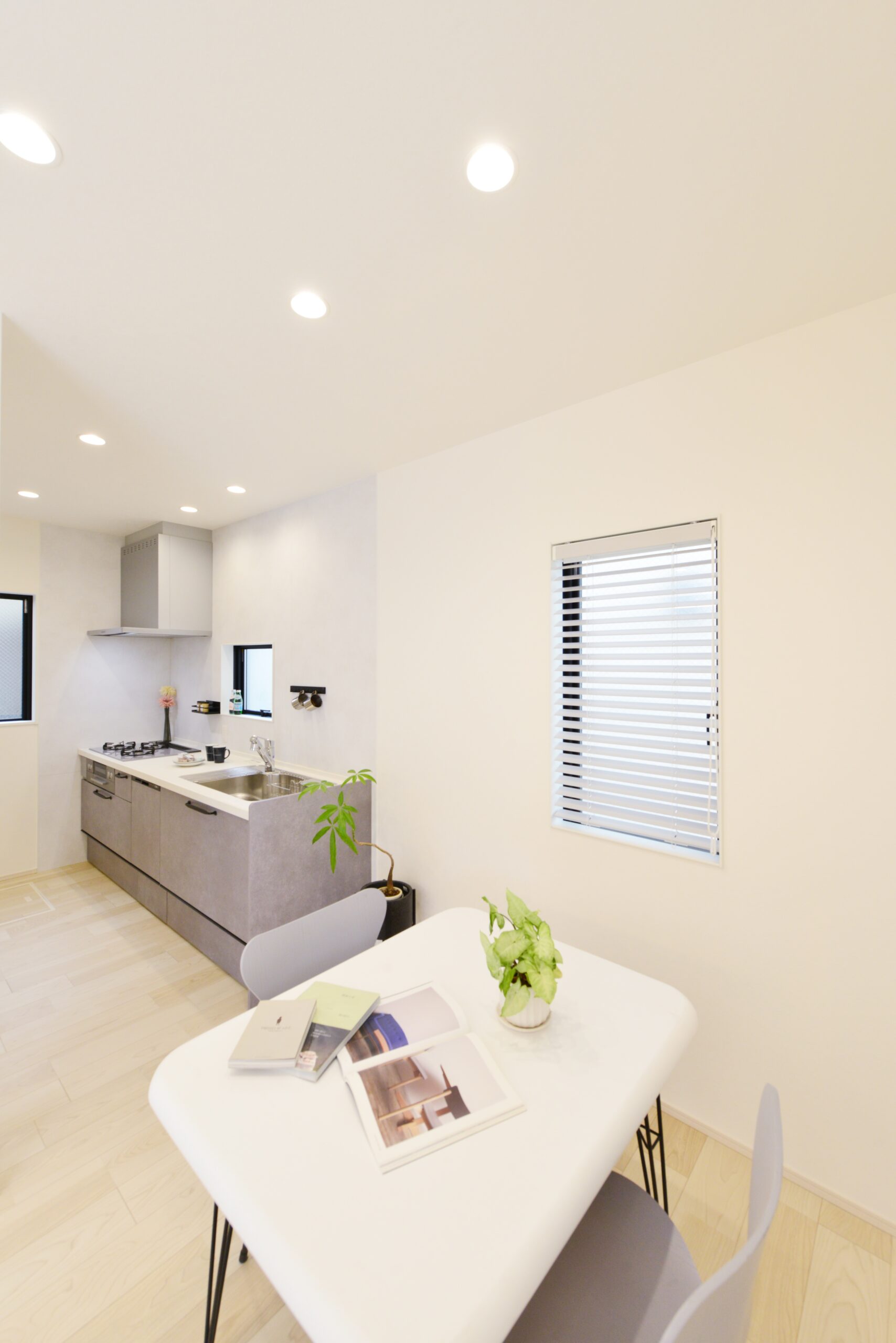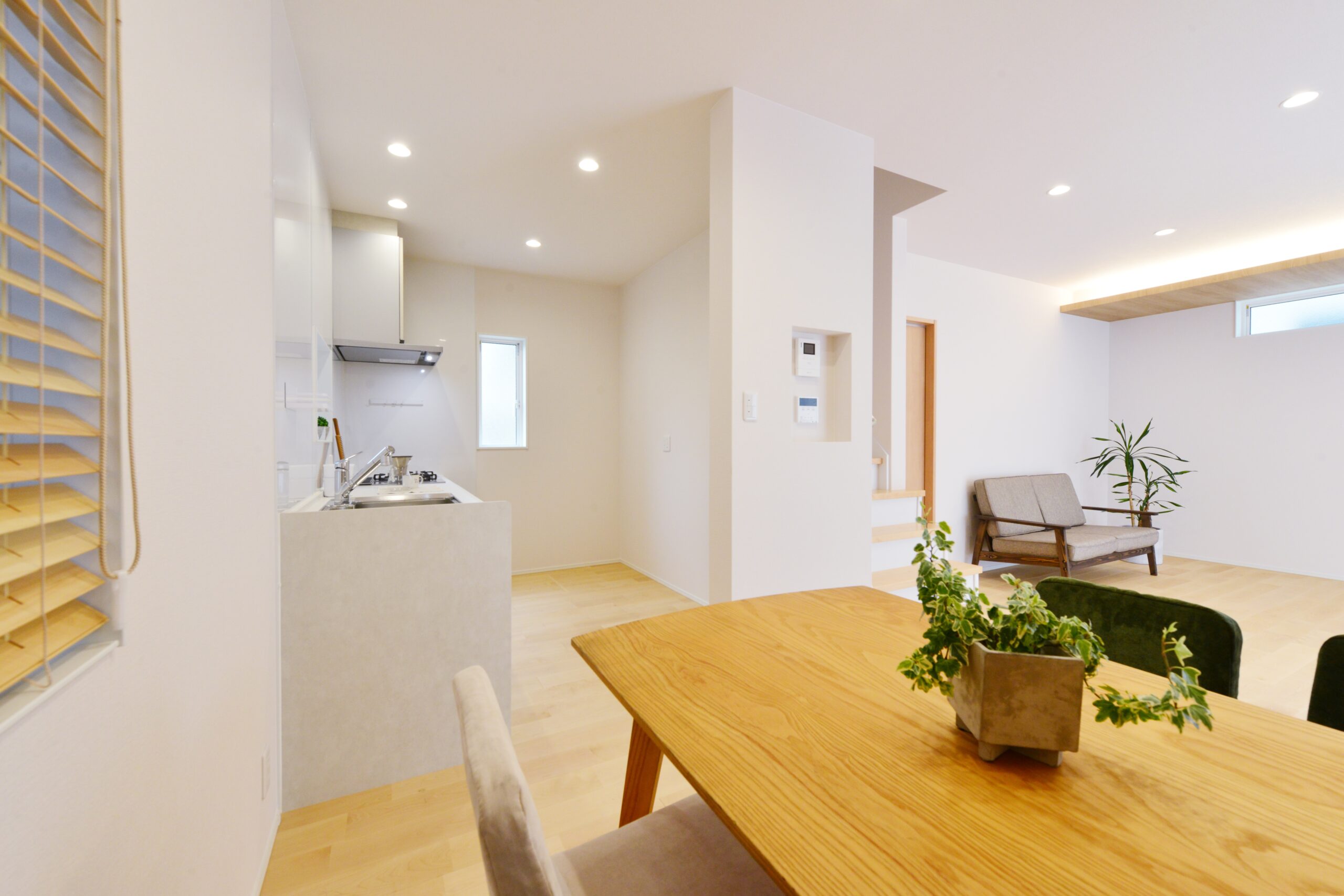 窓から光が射し込む明るく開放的なリビング。ダイニングとキッチンは横に繋がり動線もスムーズに、家族の会話を楽しみながらお料理も楽しむことができます。