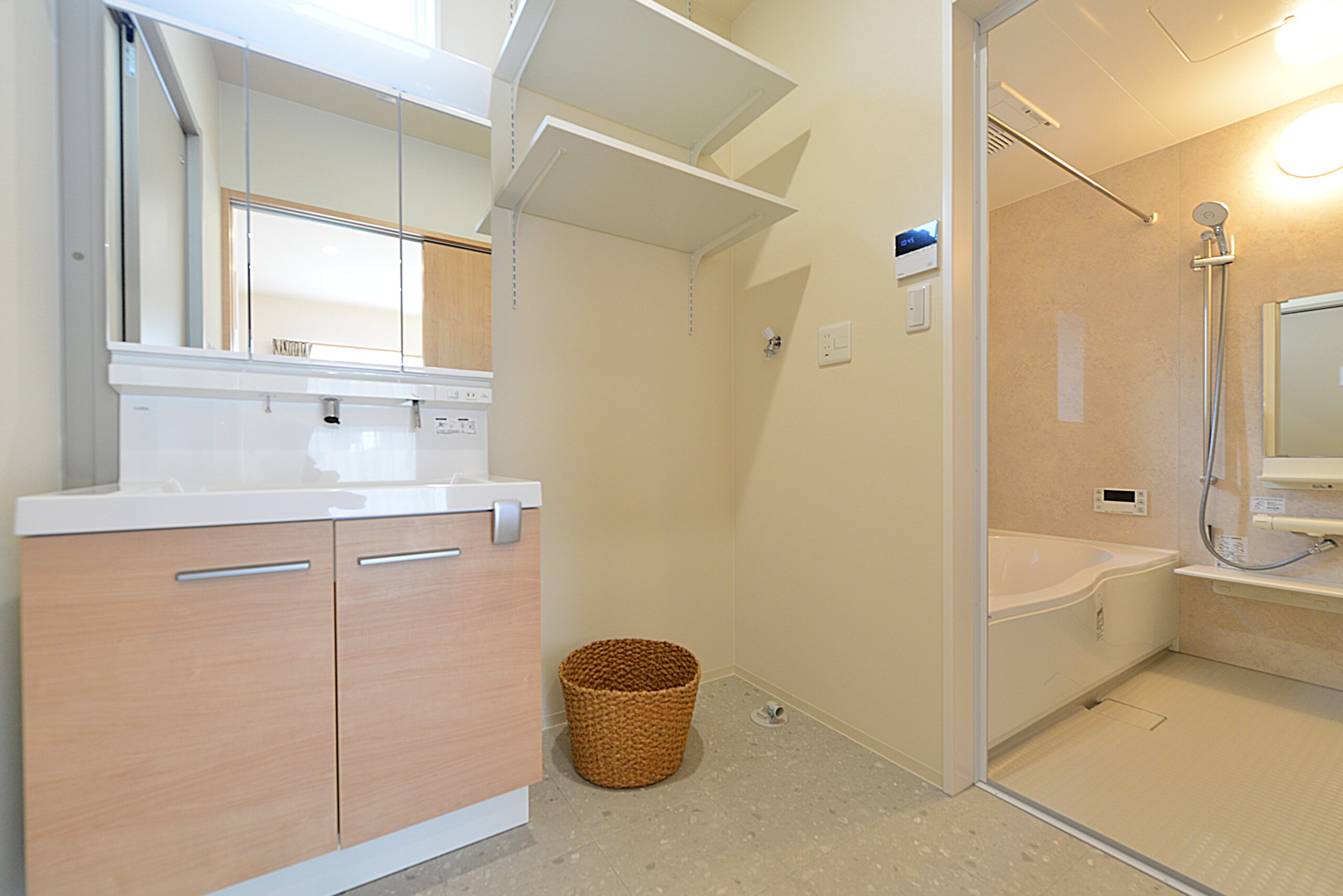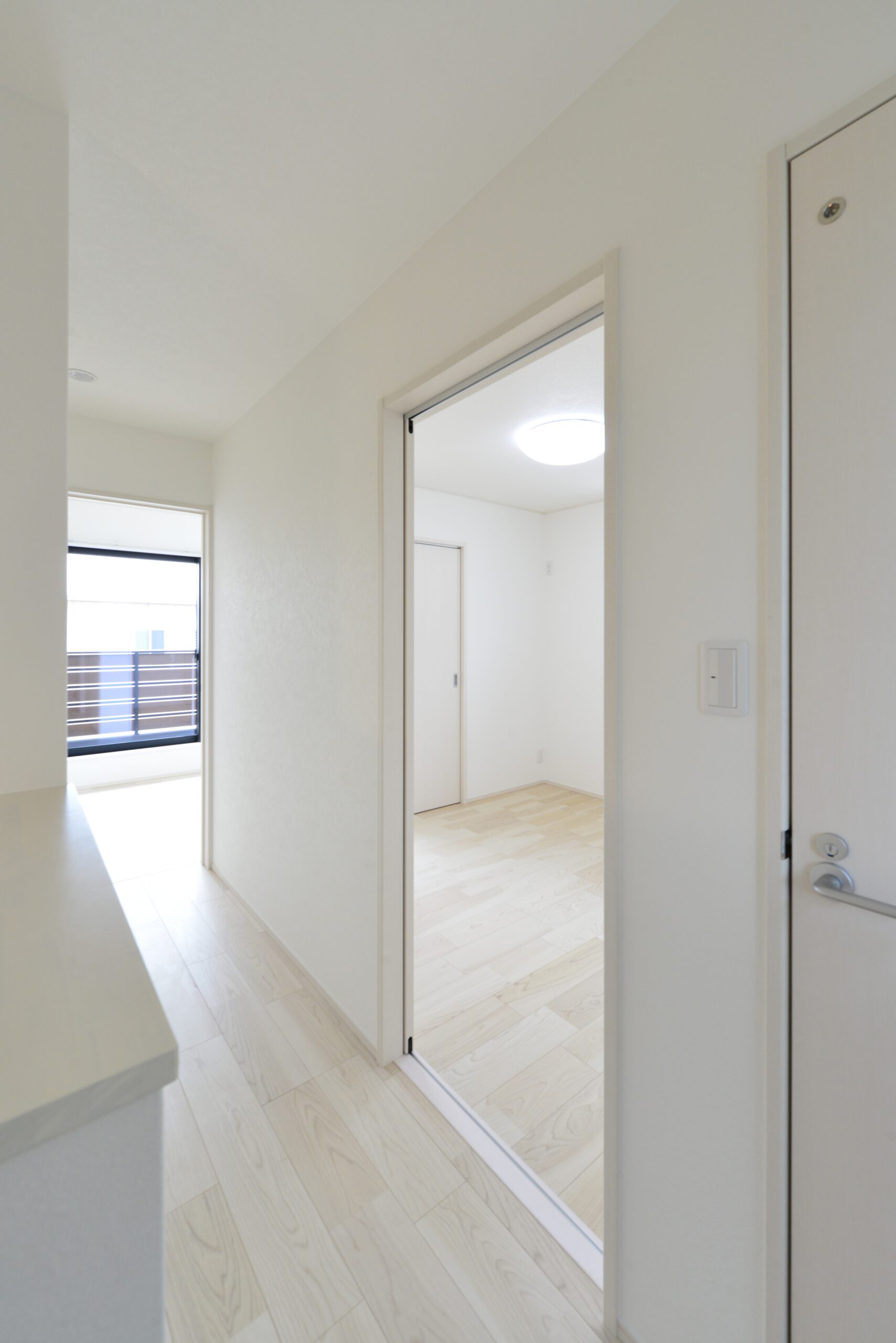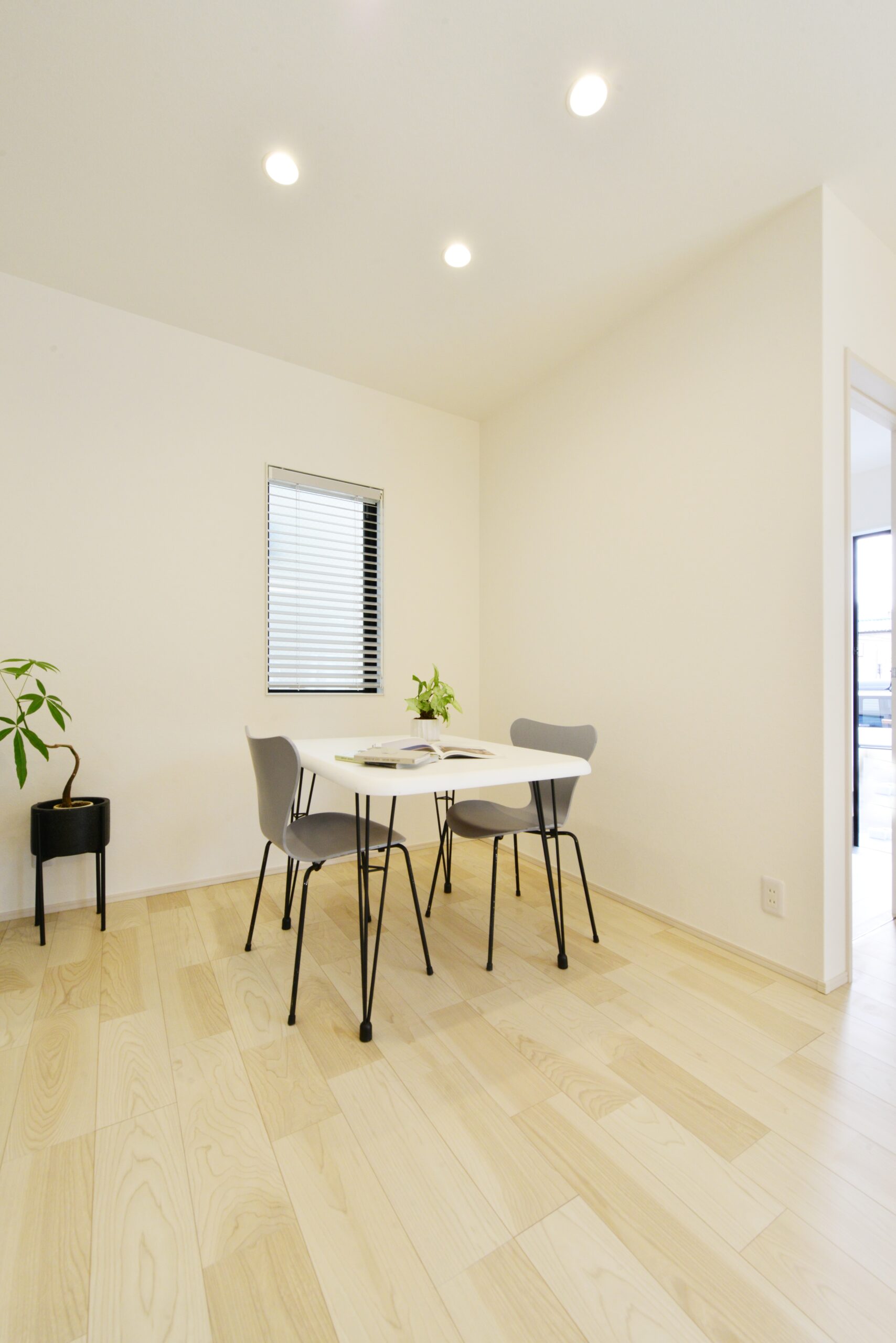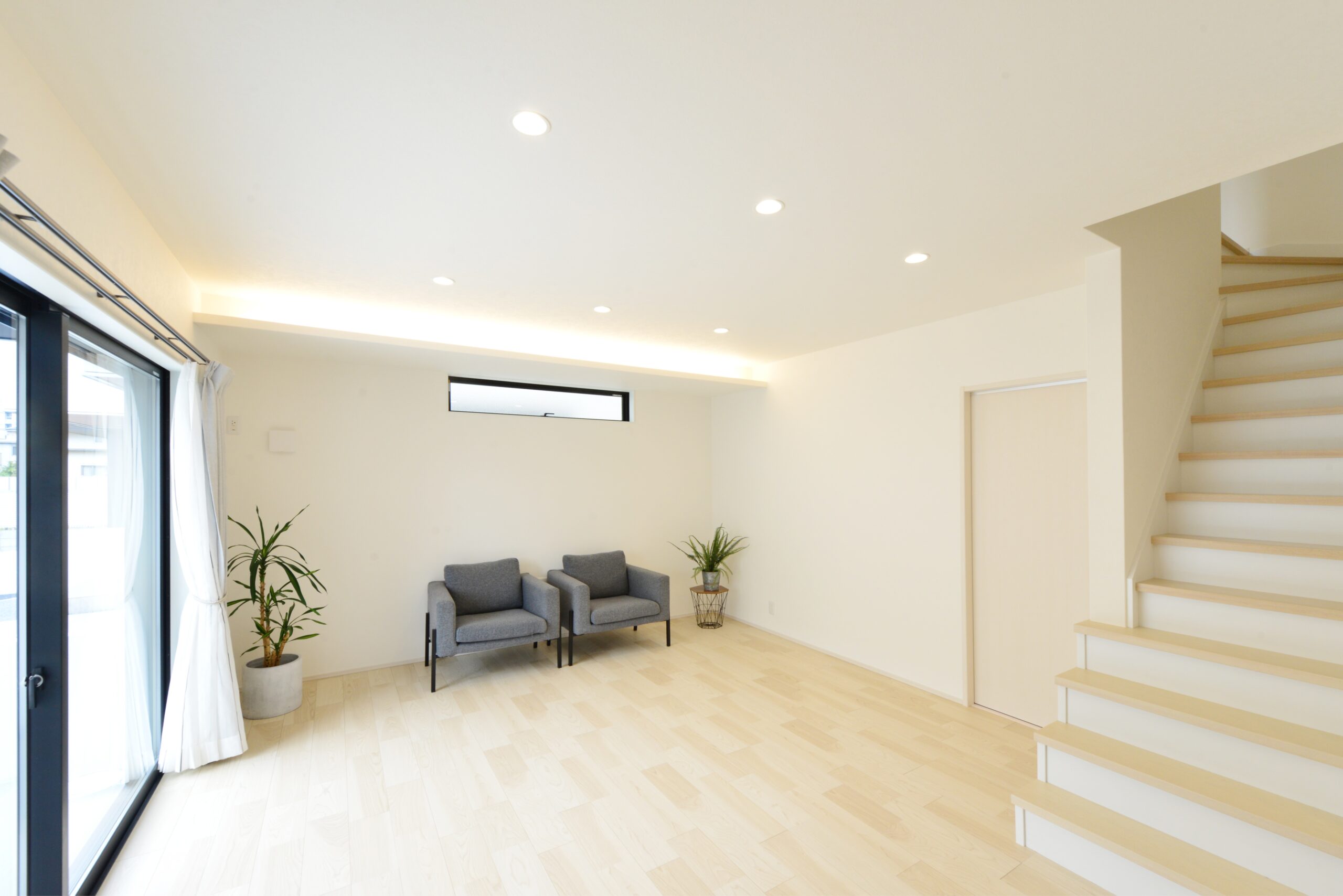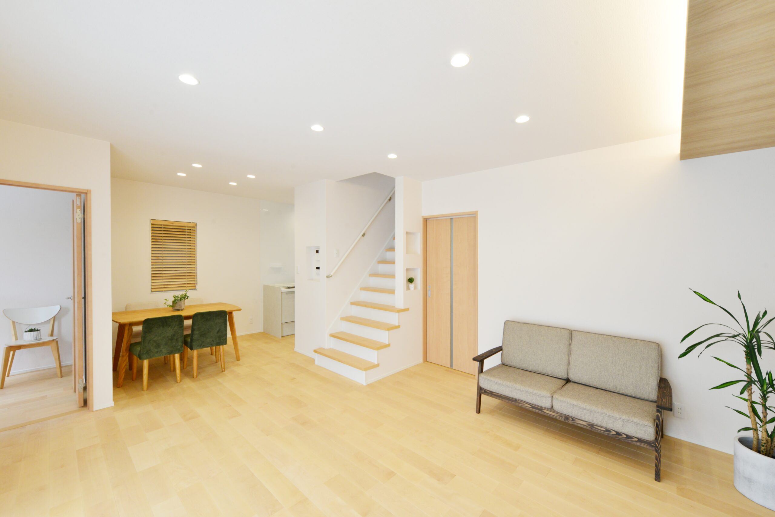 窓から光が射し込む明るく開放的なリビング。ダイニングとキッチンは横に繋がり動線もスムーズに、家族の会話を楽しみながらお料理も楽しむことができます。