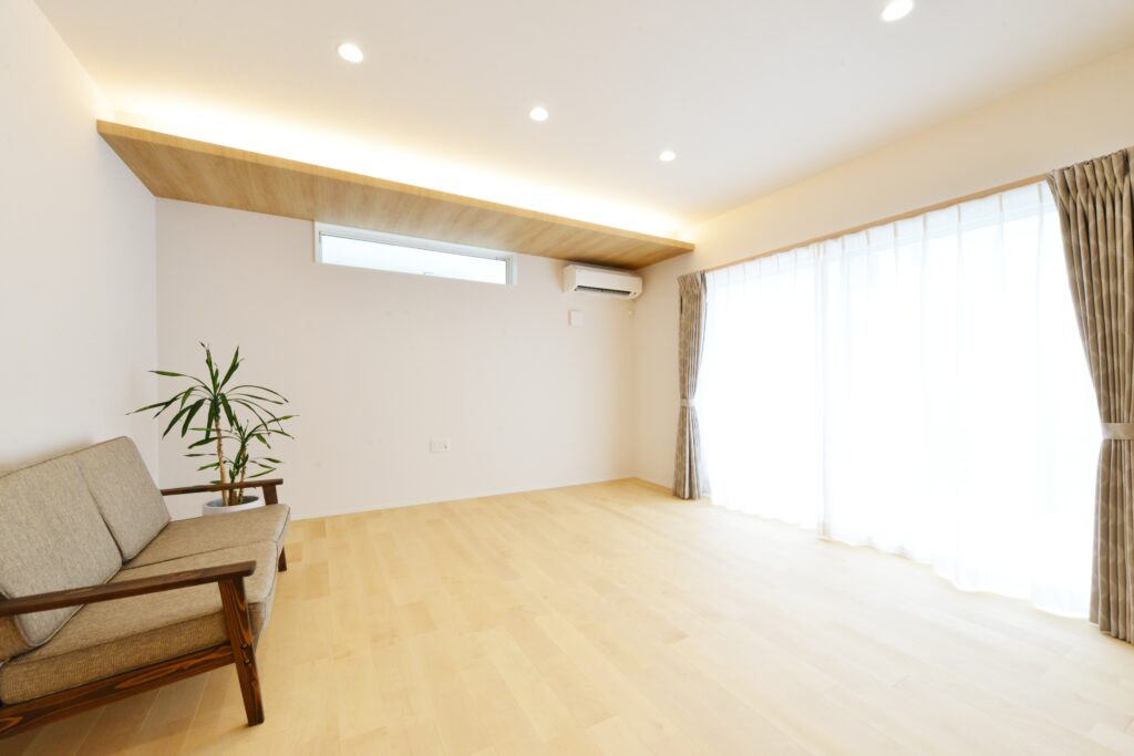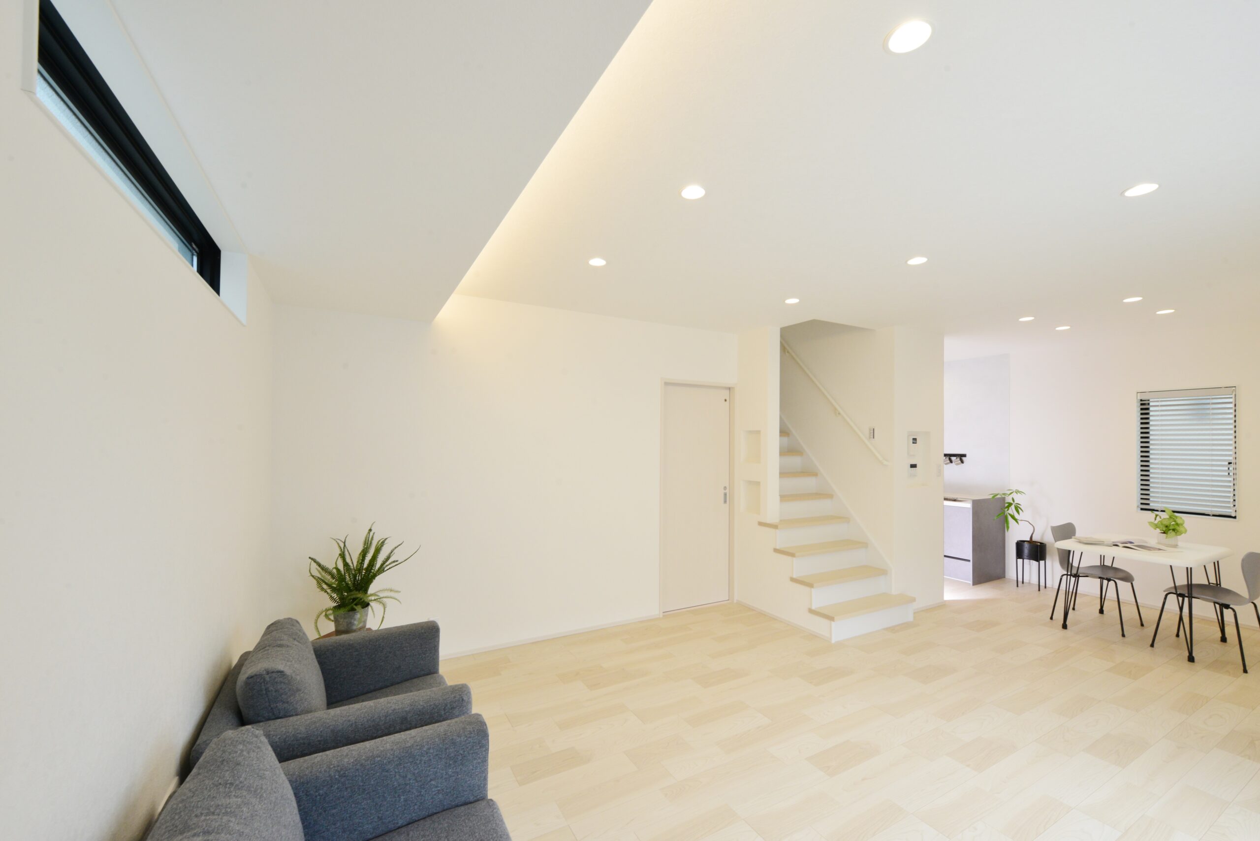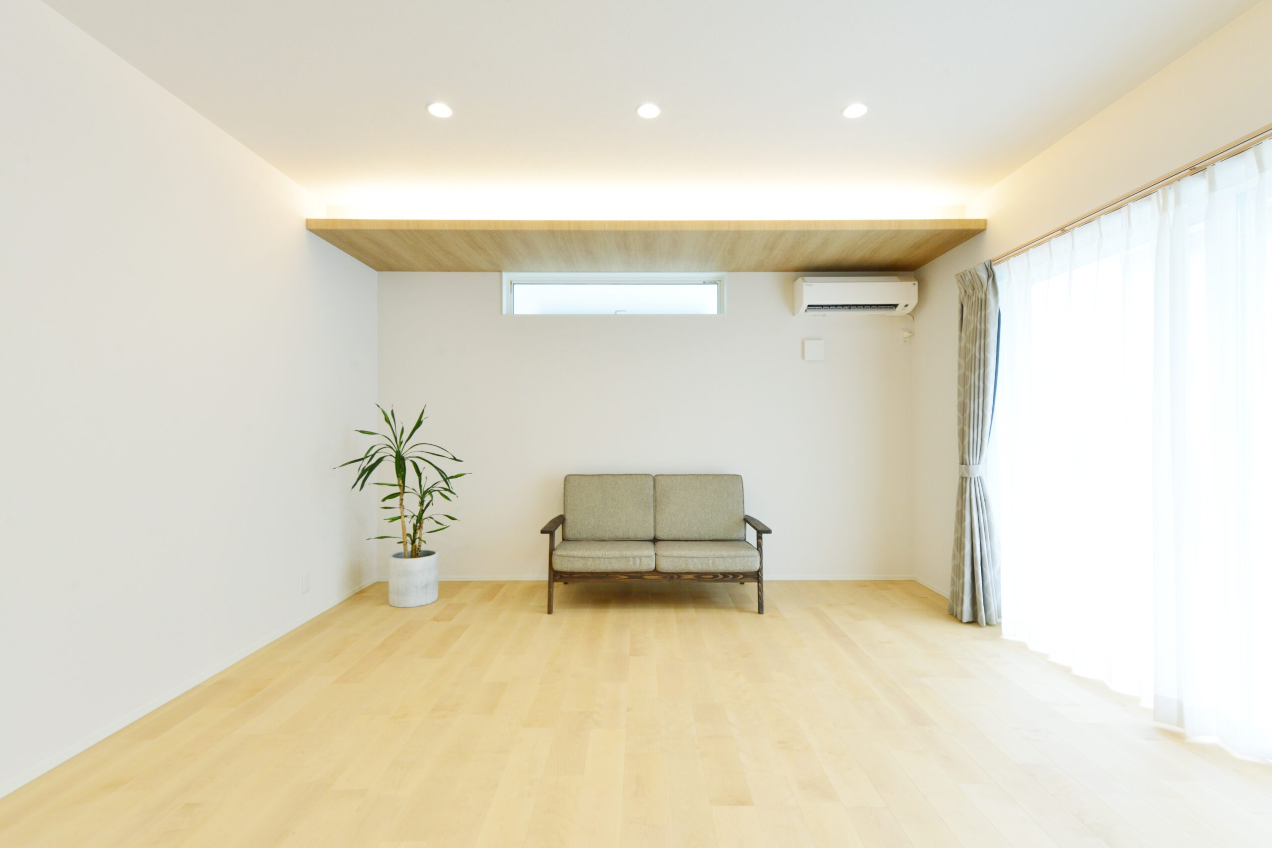 立体感溢れるおしゃれな空間演出を。間接照明の光と影のコントラストが空間に奥行きや立体感を生み出し、お部屋を広く見せてくれます。床材は幅広のサクラ無垢材を使用