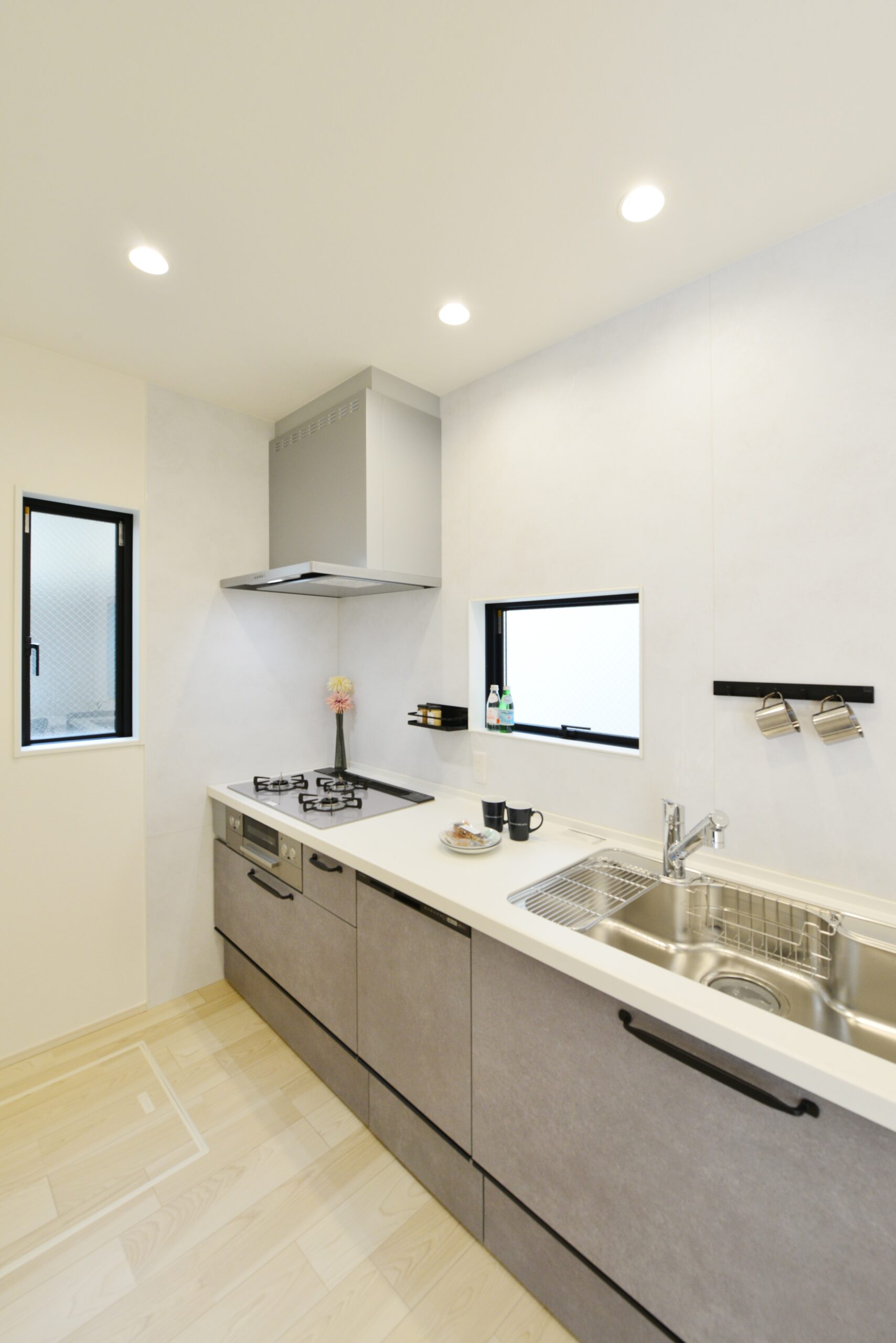 グレーで統一したキッチンは収納も豊富。機能性もお手入れも簡単にできるように考えてセレクトしています