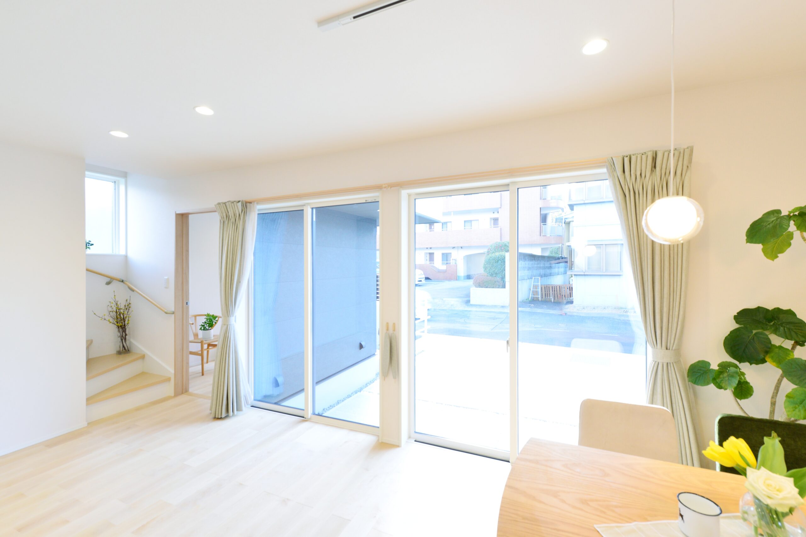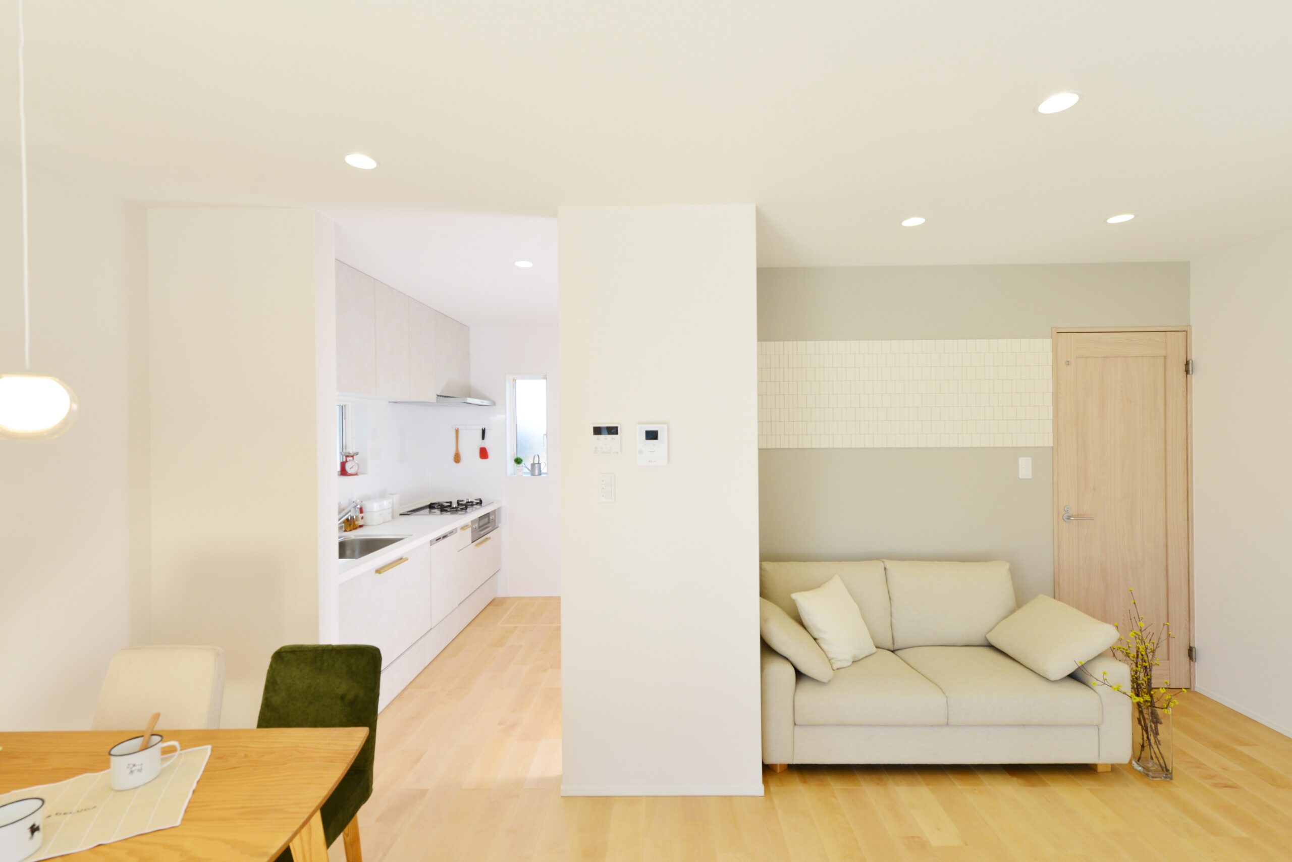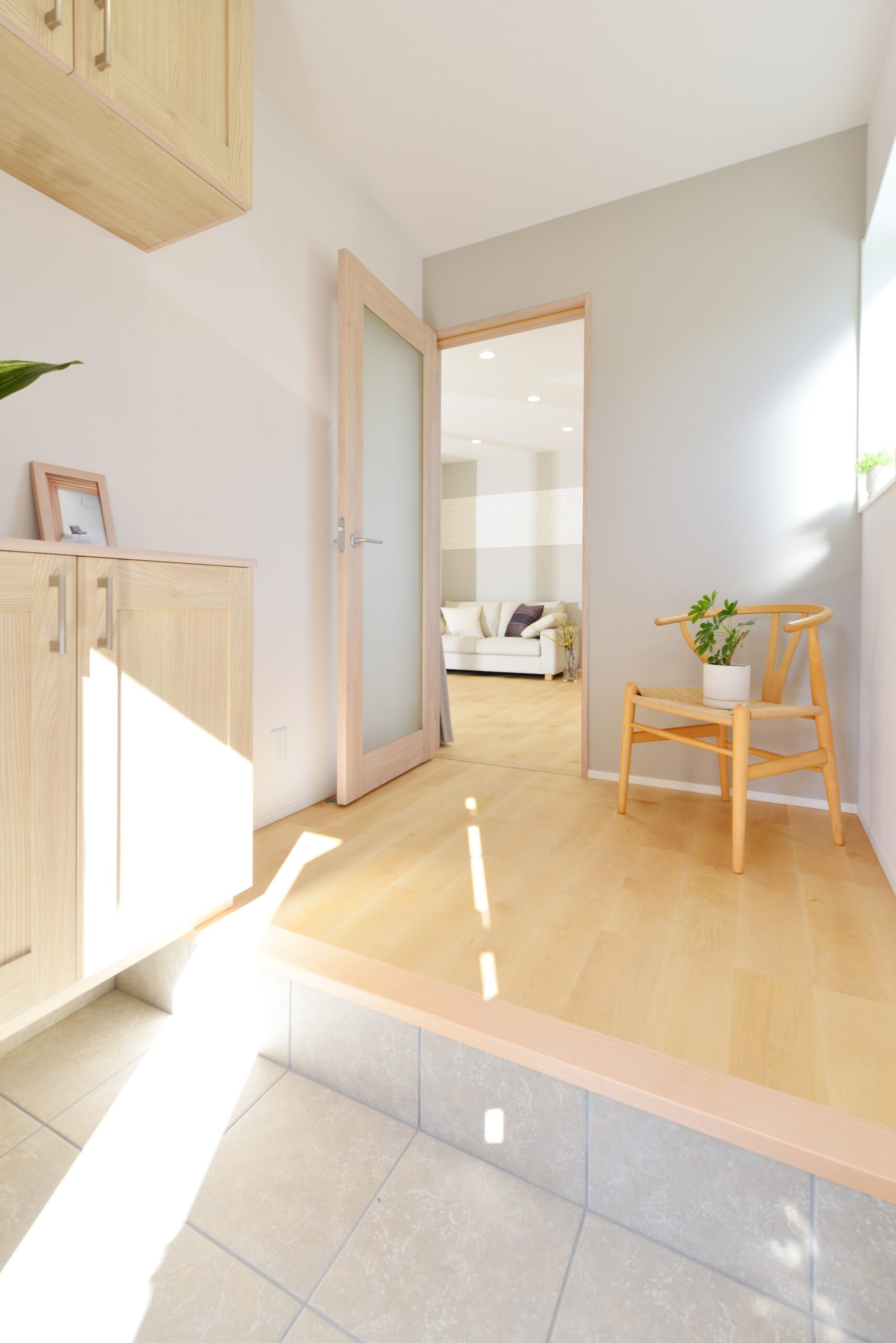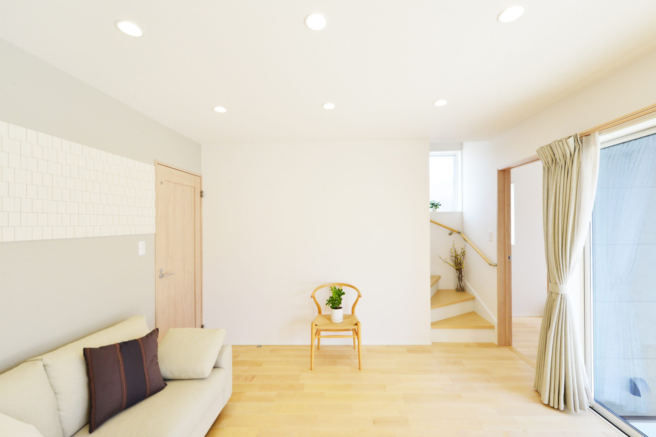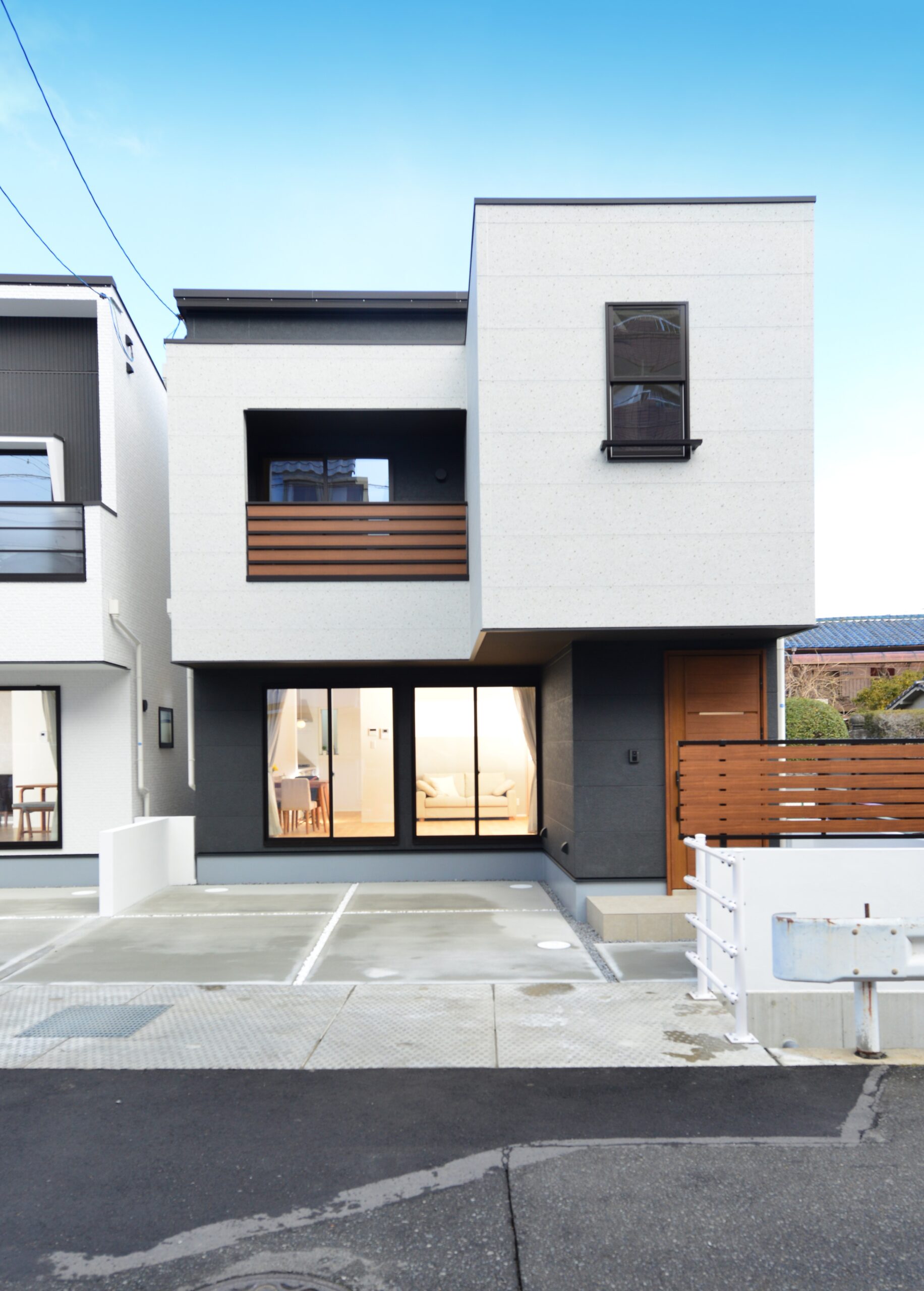 モノトーンカラーの立体的でスタイリッシュな外観。玄関を入ると床材のサクラ(無垢材)とメイプル色の建具の木目の色合いがやさしく迎えてくれます。リビングの壁にはエコカラットを施工し素材の変化もつけることでナチュラルテイストでありながらもアクセントのある空間を演出。