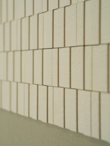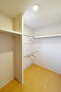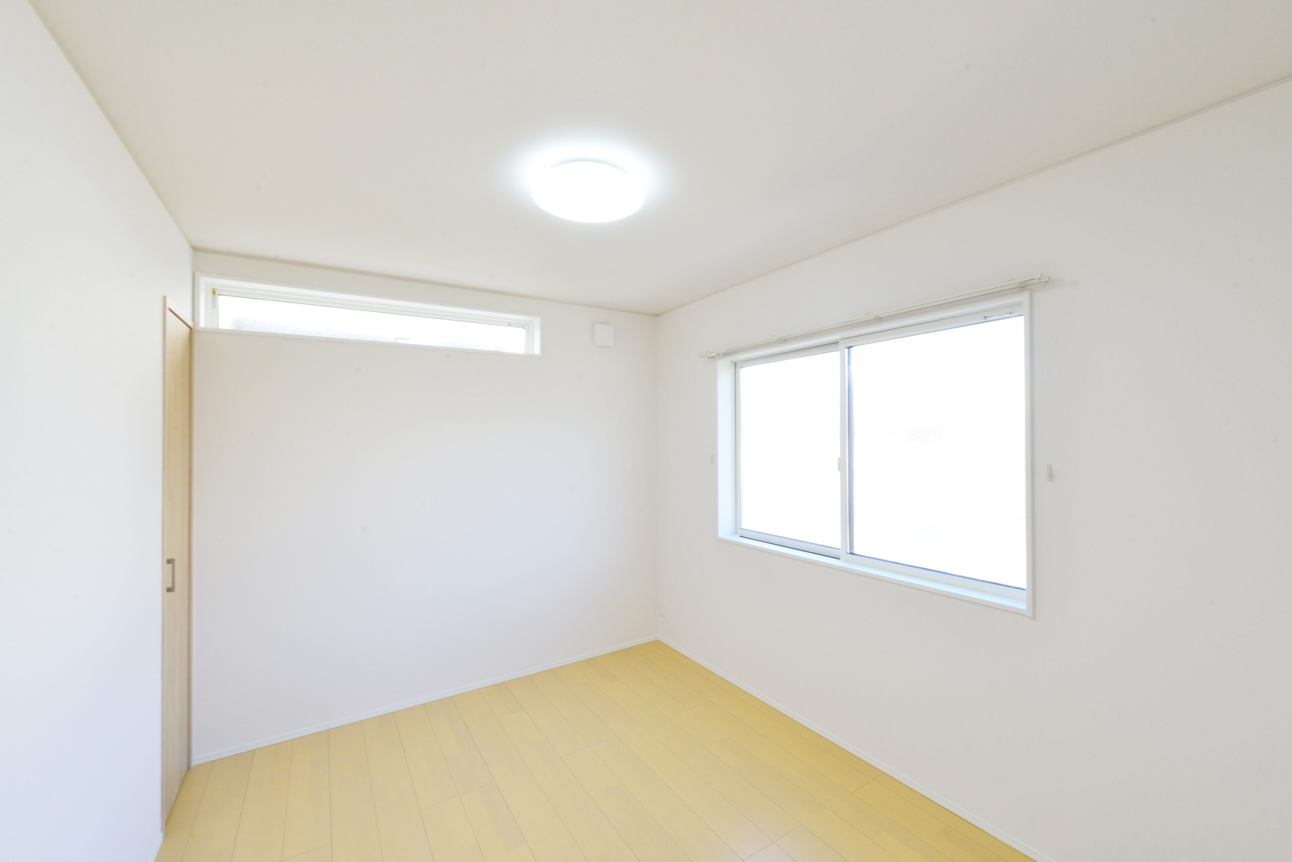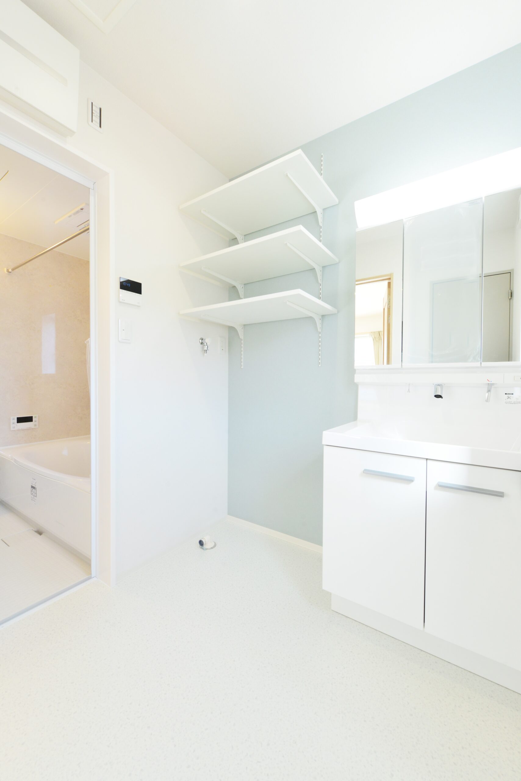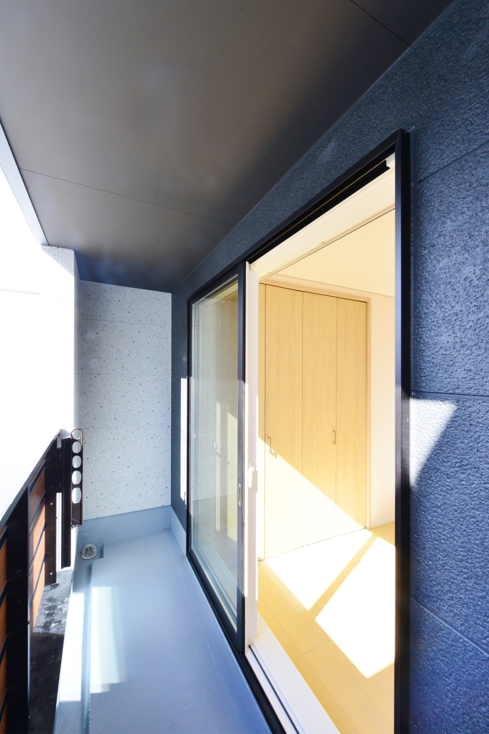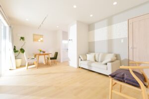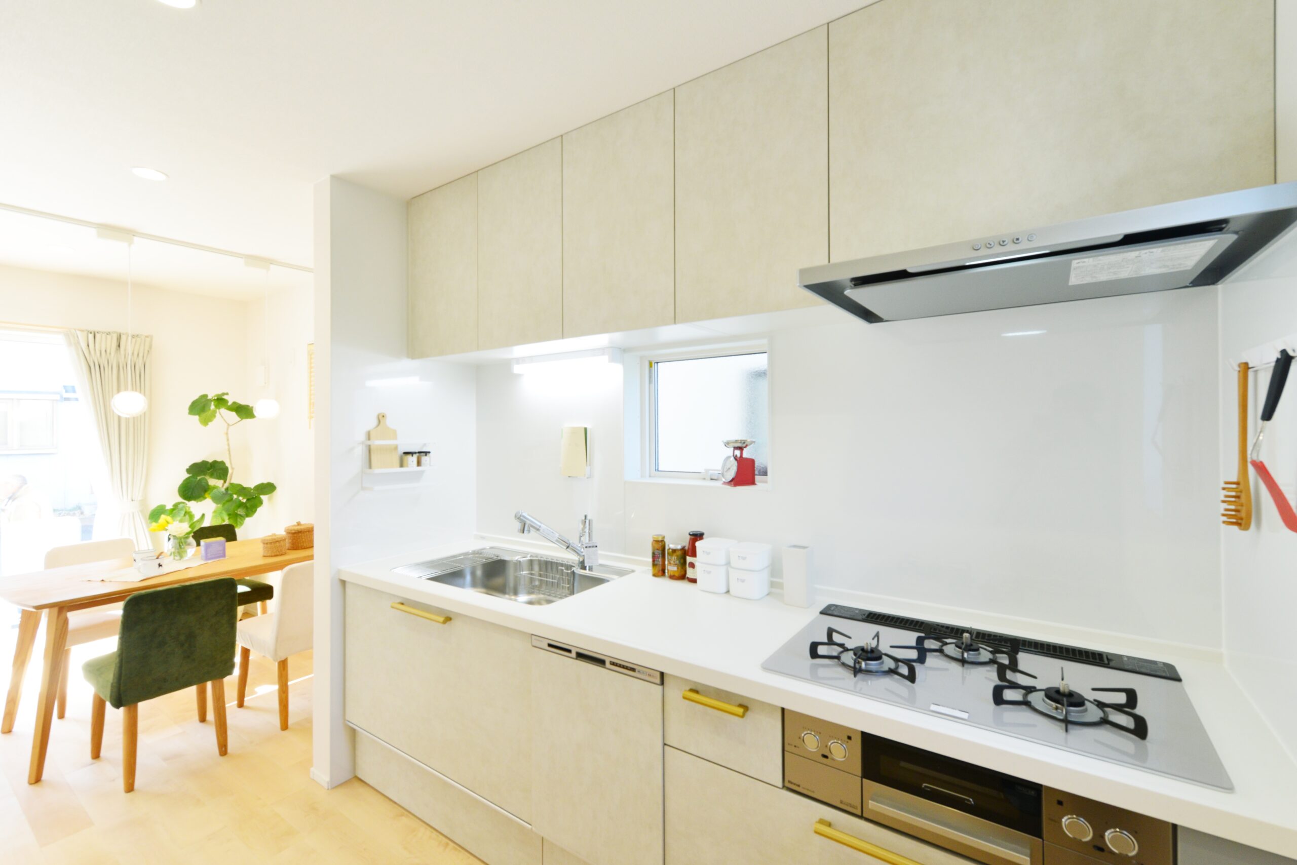 モノトーンカラーの立体的でスタイリッシュな外観。玄関を入ると床材のサクラ(無垢材)とメイプル色の建具の木目の色合いがやさしく迎えてくれます。リビングの壁にはエコカラットを施工し素材の変化もつけることでナチュラルテイストでありながらもアクセントのある空間を演出。