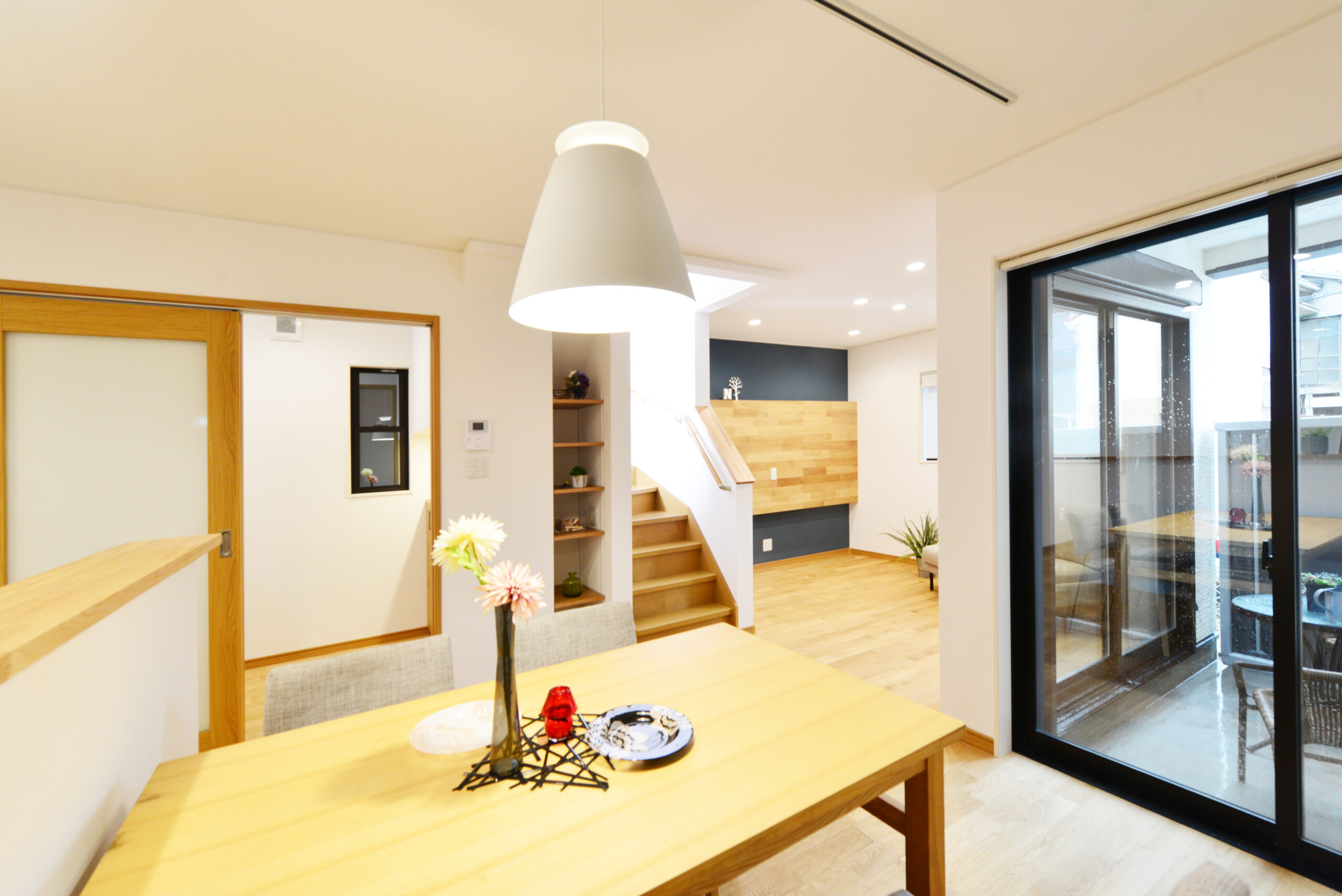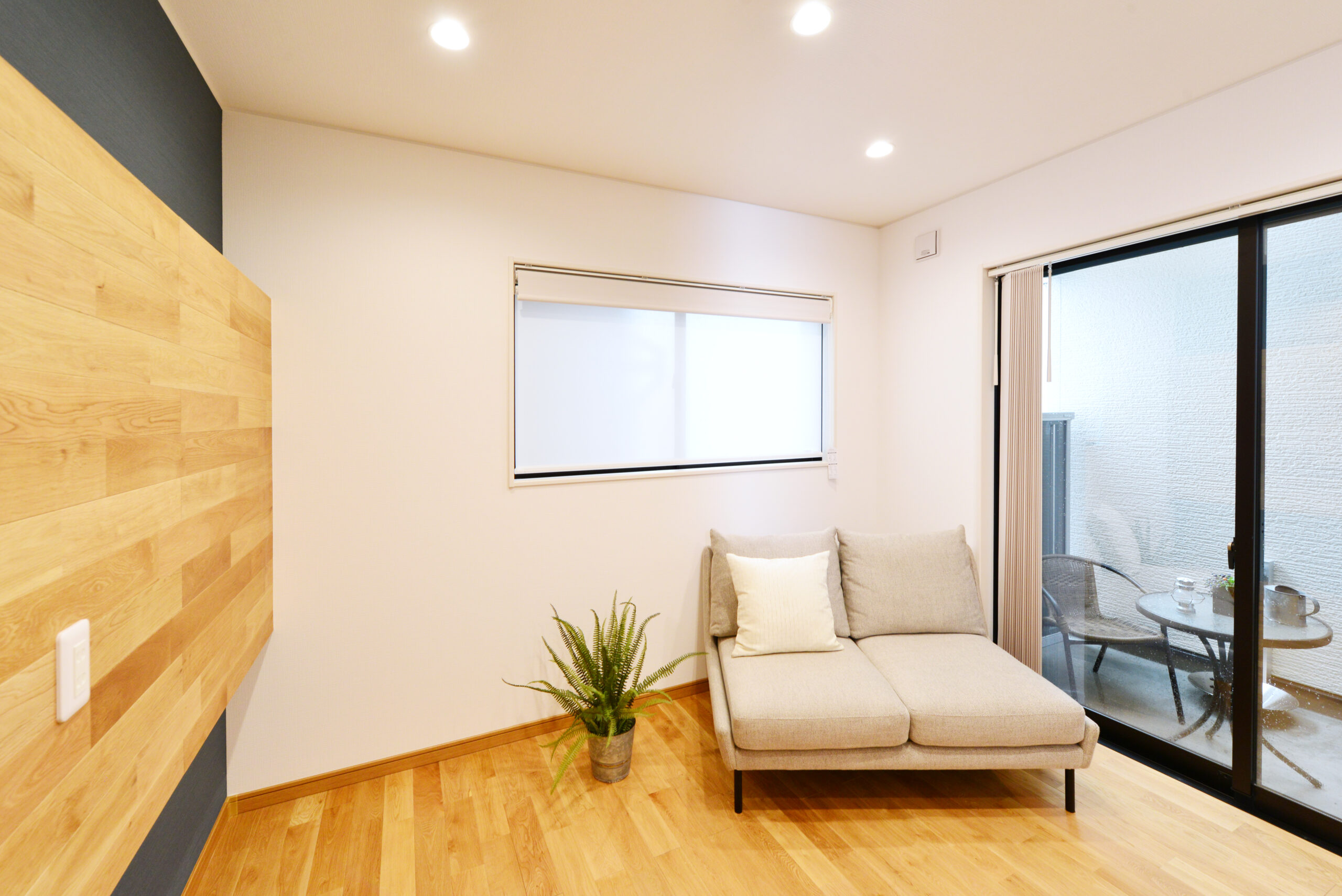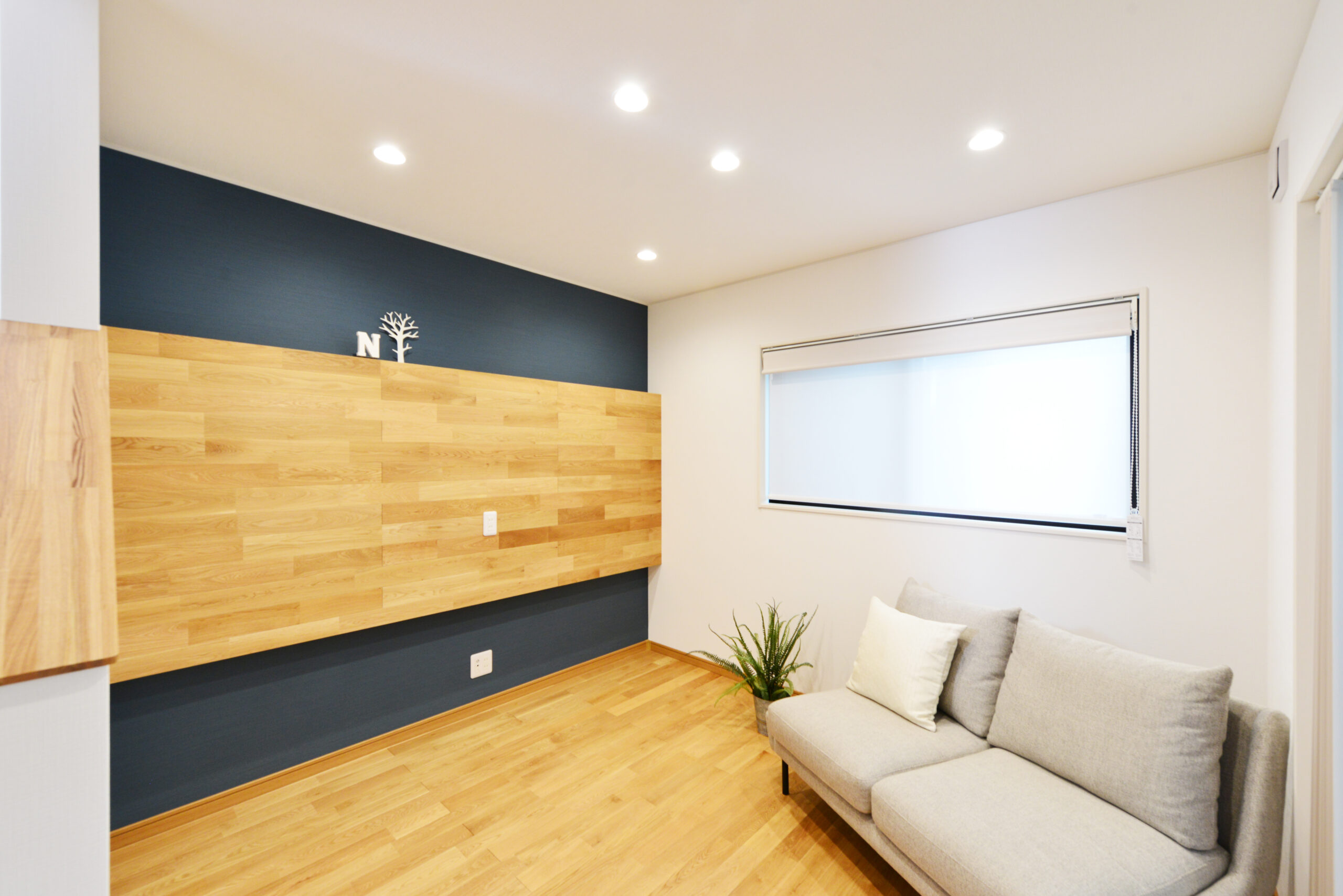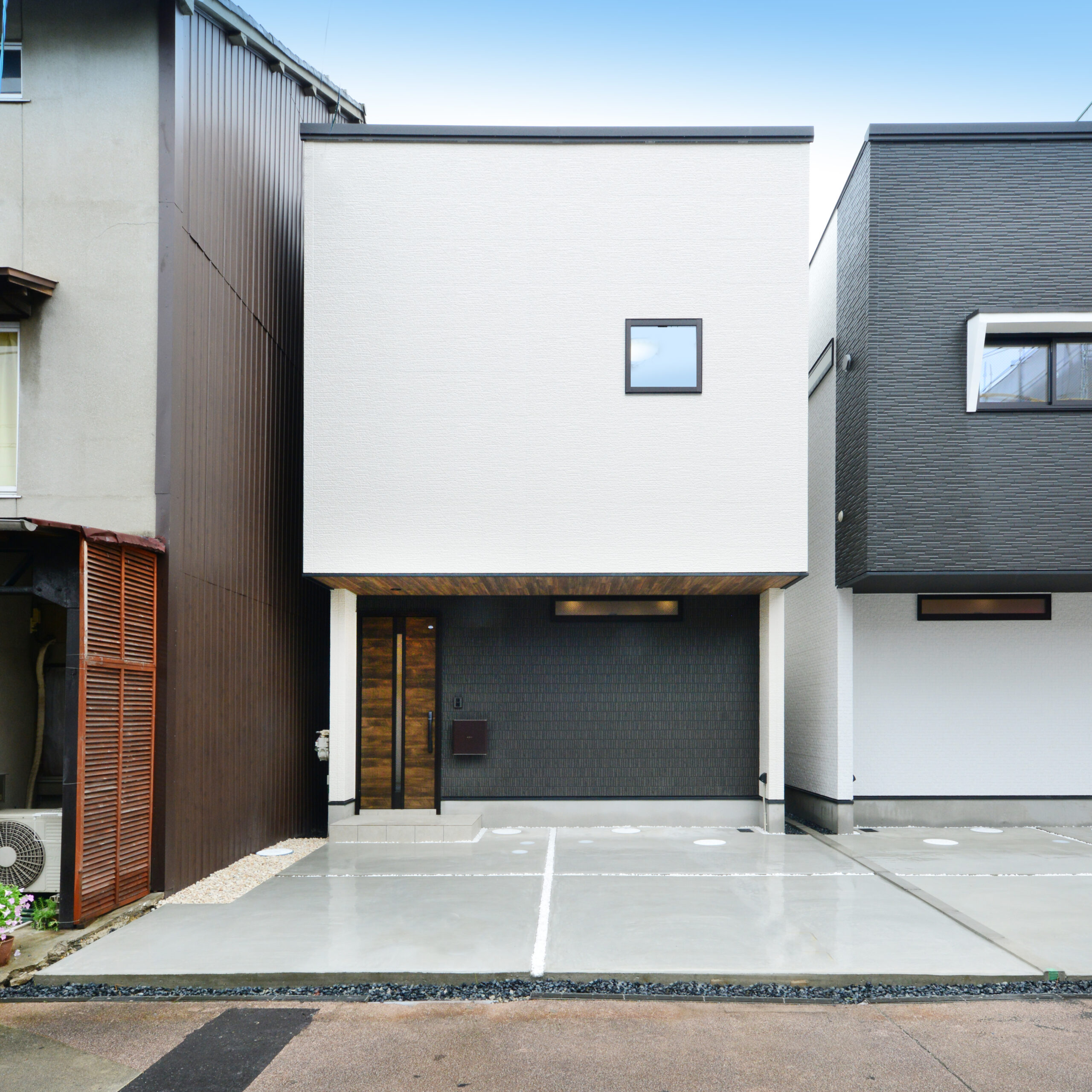 街中に居ながらプライベートを大切にした動線と空間設計。ホワイトとブラックの組み合わせに、正方形や横スリットの窓がシャールナ印象の外観。開放的なL字型のLDKとアクセントのブルーの壁面×温もりを感じさせてくれるナラ材の板張り、心地よいフリースペースのようなリビングは、こもり感がある個性的な空間に。中庭では日常を少し切り離して自分時間を楽しめる空間も。