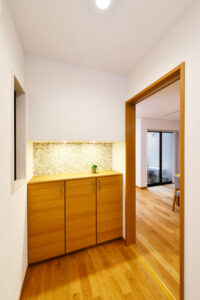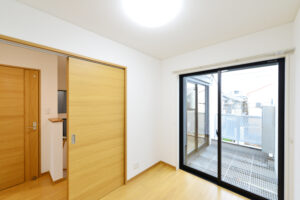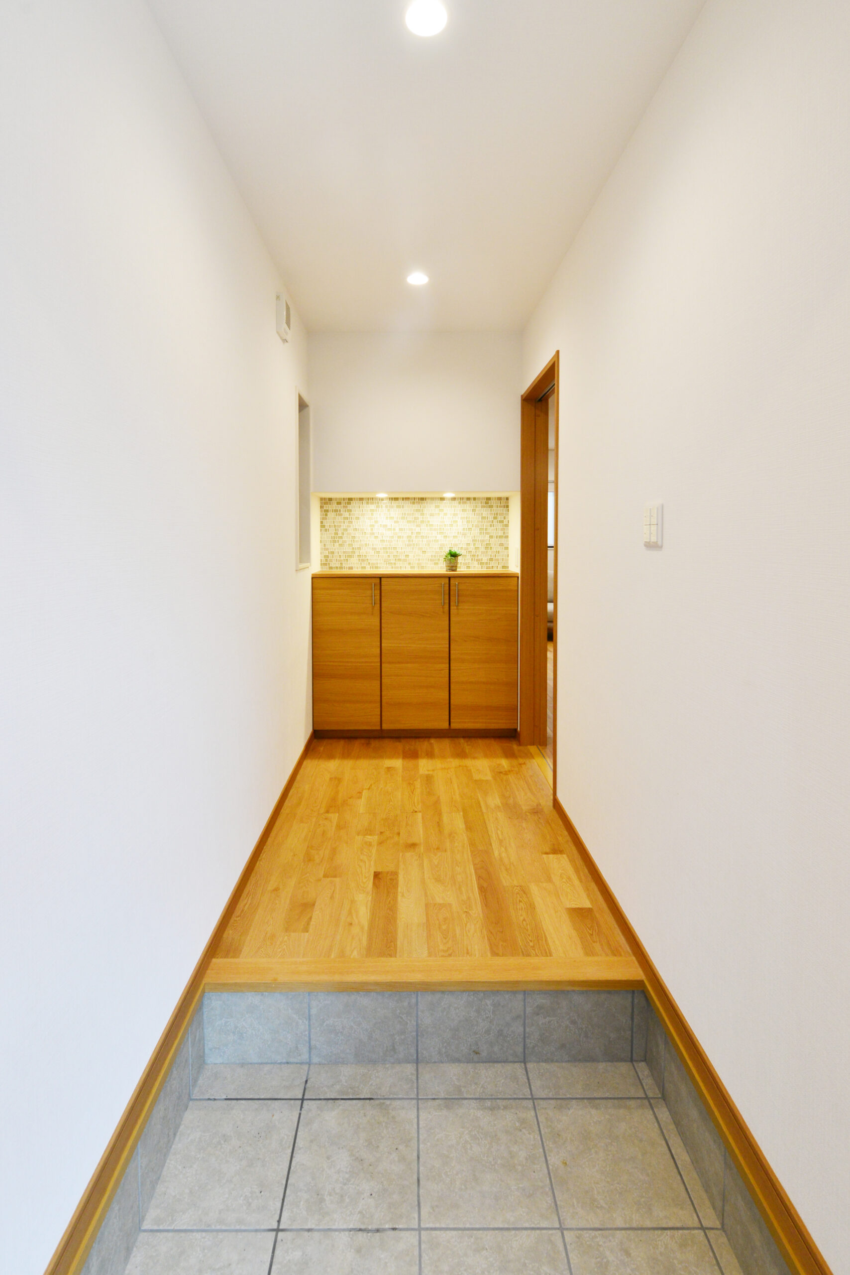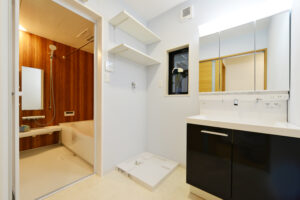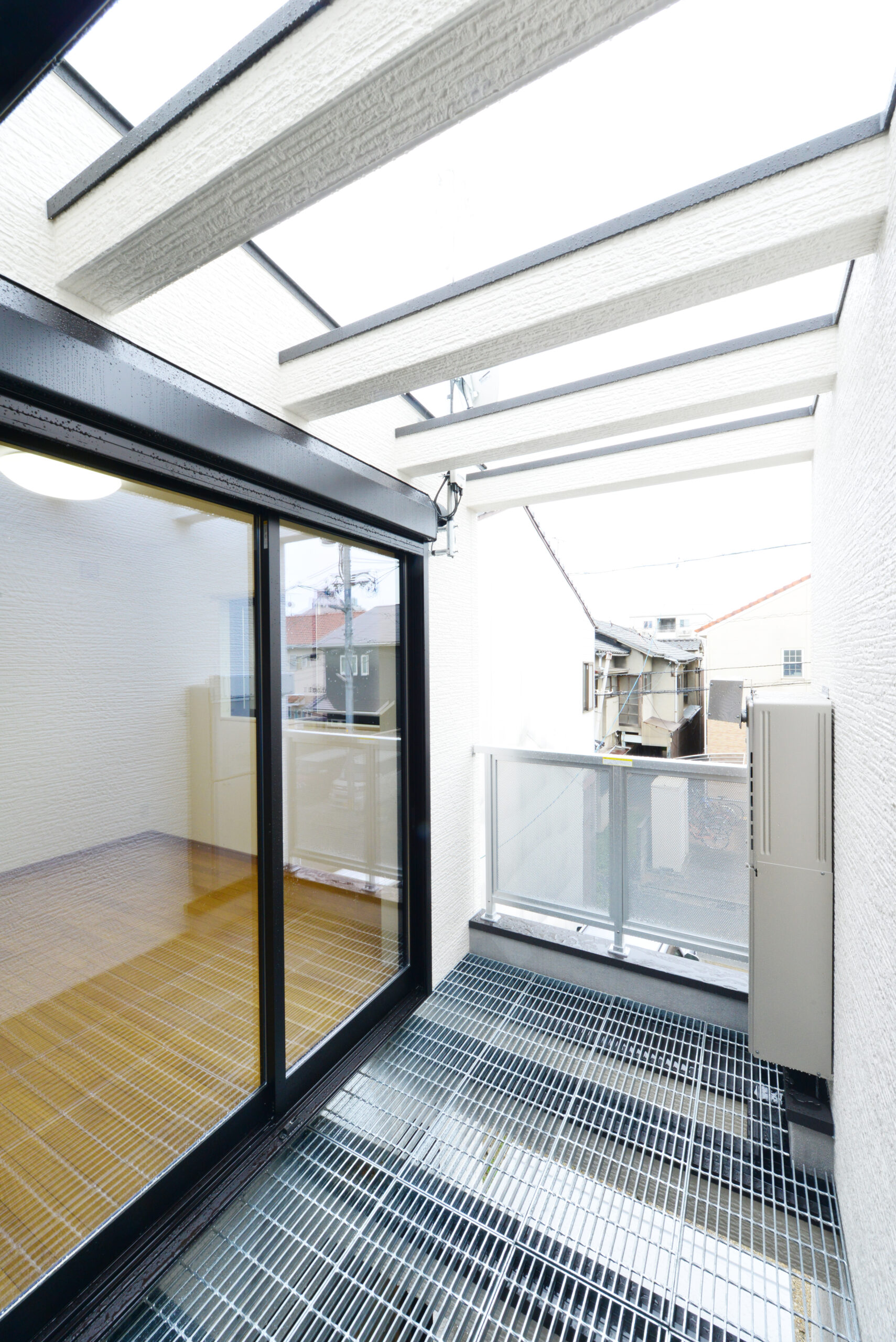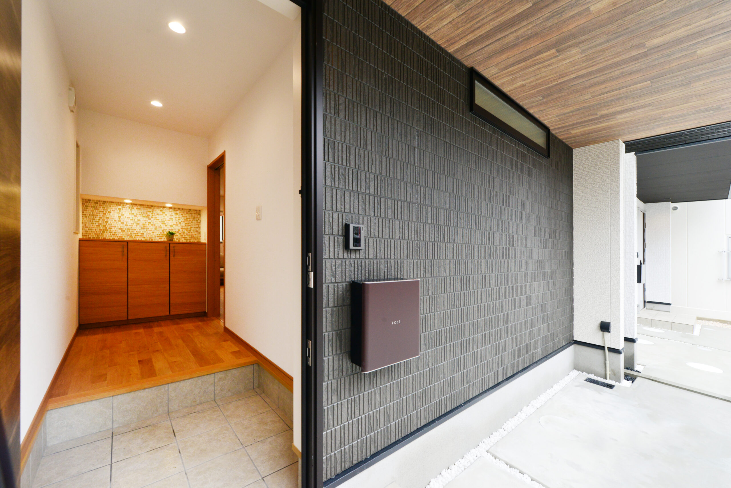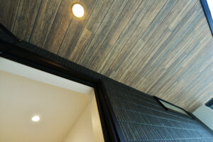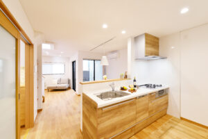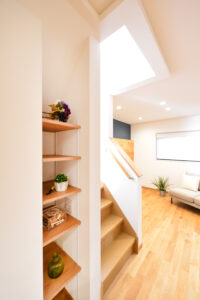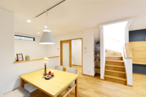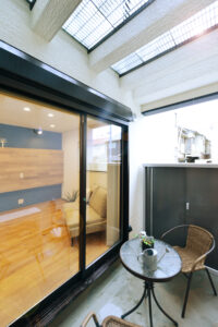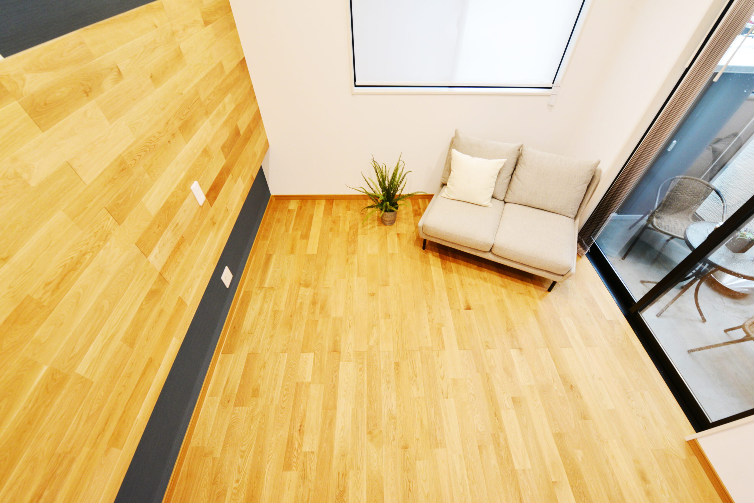 街中に居ながらプライベートを大切にした動線と空間設計。ホワイトとブラックの組み合わせに、正方形や横スリットの窓がシャールナ印象の外観。開放的なL字型のLDKとアクセントのブルーの壁面×温もりを感じさせてくれるナラ材の板張り、心地よいフリースペースのようなリビングは、こもり感がある個性的な空間に。中庭では日常を少し切り離して自分時間を楽しめる空間も。