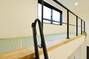 JR岡山駅から数分の立地とまさしくマチナカハウス。 インナーガレージ付きのお家。 ロフトは開放的なデザインで、下の階とのつながりを 感じ大きな窓から光が差し込み、観葉植物が配置された 明るい空間です。 フローリングと白い壁が、ナチュラルで清潔感のある 雰囲気を演出しています。 黒いスチール製のスケルトン階段と手すりが、 空間のアクセントに。